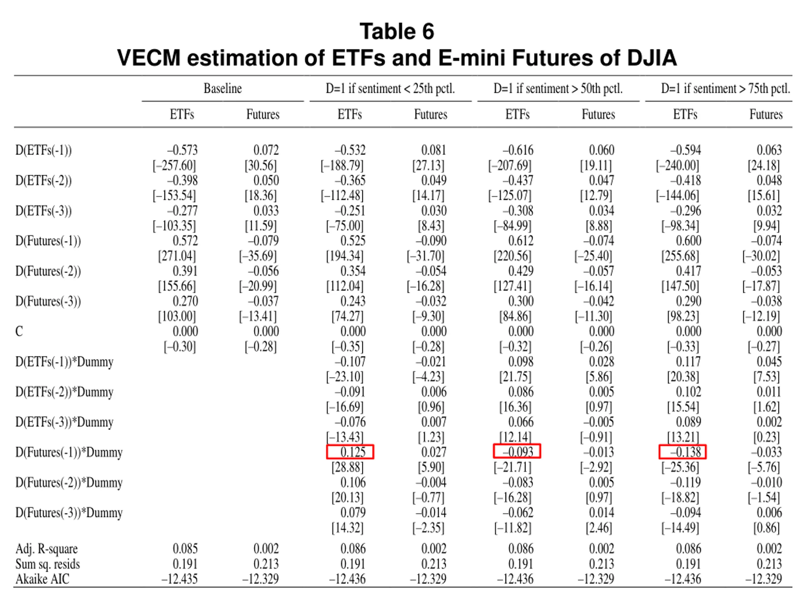 Table 6 VECM estimation of ETFs and E-mini Futures of DJIA Baseline D=1 if sentiment < 25th pctl. D=1 if sentiment > 50th pctl. D=1 if sentiment > 75th pctl. D(ETFs(-1)) D(ETFs(-2)) D(ETFs(-3)) D(Futures(-1)) D(Futures(-2)) D(Futures(-3)) C D(ETFs(-1))*Dummy D(ETFs(-2))*Dummy D(ETFs(-3))*Dummy D(Futures(-1))*Dummy D(Futures(-2))*Dummy D(Futures(-3))*Dummy Adj. R-square Sum sq. resids Akaike AIC ETFs Futures [ 188.79] 0.365 [ 112.48] 0.251 [ 75.00] [194.34] [112.04] [74.27] [ 0.35] 0.107 [ 23.10] 0.091 [ 16.69] 0.076 [ 13.43] [28.88] [20.13] [14.32] 12.436 ETFs Futures [ 207.69] 0.437 [ 125.07] 0.308 [ 84.99] [220.56] [127.41] [84.86] [ 0.32] [21.75] [16.36] [12.14] 0.093 [ 21.71] 0.083 [ 16.28] 0.062 [ 11.82] 12.436 ETFs Futures [ 240.00] 0.418 [ 144.06] 0.296 [ 98.34] [255.68] [147.50] [98.23] [ 0.33] [20.38] [15.54] [13.21] 0.138 [ 25.36] 0.119 [ 18.82] 0.094 [ 14.49] 12.436 ETFs Futures 0.573 [ 257.60] 0.398 [ 153.54] 0.277 [ 103.35] 0.572 [271.04] 0.391 [155.66] 0.270 [103.00] 0.000 [ 0.30] 0.072 [30.56] 0.050 [18.36] 0.033 [11.59] 0.079 [ 35.69] 0.056 [ 20.99] 0.037 [ 13.41] 0.000 [ 0.28] 0.002 0.213 12.329 0.532 0.081 [27.13] 0.049 [14.17] 0.030 [8.43] 0.090 [ 31.70] 0.054 [ 16.28] 0.032 [ 9.30] 0.000 [ 0.28] 0.021 [ 4.23] 0.006 [0.96] 0.007 [1.23] 0.027 [5.90] 0.004 [ 0.77] 0.014 [ 2.35] 0.002 0.213 12.329 0.616 0.060 [19.11] 0.047 [12.79] 0.034 [8.88] 0.074 [ 25.40] 0.057 [ 16.14] 0.042 [ 11.30] 0.000 [ 0.26] 0.028 [5.86] 0.005 [0.97] 0.005 [ 0.91] 0.013 [ 2.92] 0.005 [0.97] 0.014 [2.46] 0.002 0.213 12.329 0.594 0.063 [24.18] 0.048 [15.61] 0.032 [9.94] 0.074 [ 30.02] 0.053 [ 17.87] 0.038 [ 12.19] 0.000 [ 0.27] 0.045 [7.53] 0.011 [1.62] 0.002 [0.23] 0.033 [ 5.76] 0.010 [ 1.54] 0.006 [0.86] 0.002 0.213 12.329 0.525 0.612 0.600 0.354 0.429 0.417 0.243 0.300 0.290 0.000 0.000 0.000 0.098 0.117 0.086 0.102 0.066 0.089 0.125 0.106 0.079 0.086 0.191 0.085 0.191 12.435 0.086 0.191 0.086 0.191