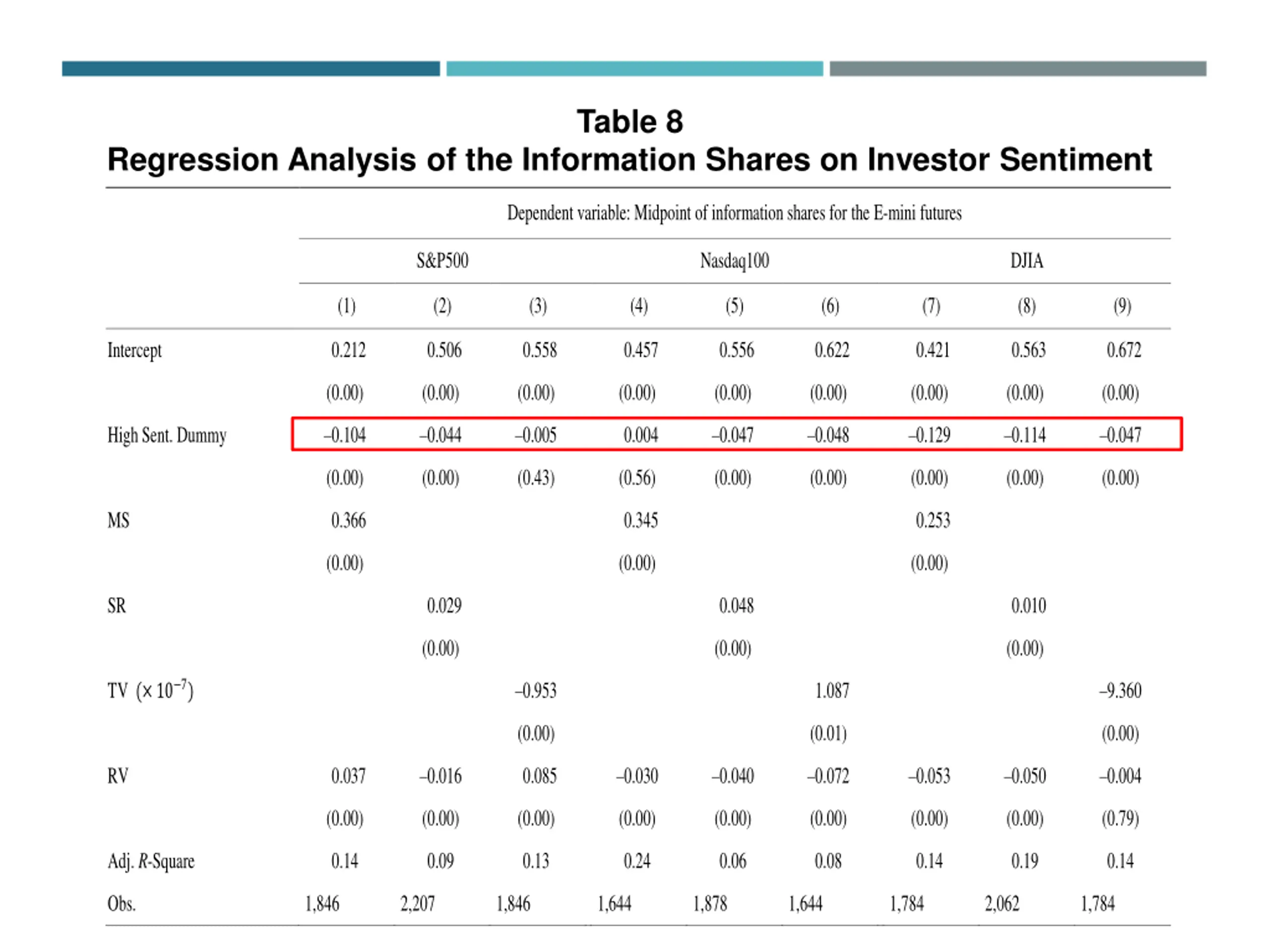 Table 8 Regression Analysis of the Information Shares on Investor Sentiment Dependent variable: Midpoint of information shares for the E-mini futures S&P500 Nasdaq100 DJIA (1) (2) (3) (4) (5) (6) (7) (8) (9) Intercept 0.212 0.506 0.558 0.457 0.556 0.622 0.421 0.563 0.672 (0.00) (0.00) (0.00) (0.00) (0.00) (0.00) (0.00) (0.00) (0.00) High Sent. Dummy 0.104 0.044 0.005 0.004 0.047 0.048 0.129 0.114 0.047 (0.00) (0.00) (0.43) (0.56) (0.00) (0.00) (0.00) (0.00) (0.00) MS 0.366 0.345 0.253 (0.00) (0.00) (0.00) SR 0.029 0.048 0.010 (0.00) (0.00) (0.00) TV ( 10 7) 0.953 1.087 9.360 (0.00) (0.01) (0.00) RV 0.037 0.016 0.085 0.030 0.040 0.072 0.053 0.050 0.004 (0.00) (0.00) (0.00) (0.00) (0.00) (0.00) (0.00) (0.00) (0.79) Adj. R-Square 0.14 0.09 0.13 0.24 0.06 0.08 0.14 0.19 0.14 Obs. 1,846 2,207 1,846 1,644 1,878 1,644 1,784 2,062 1,784
