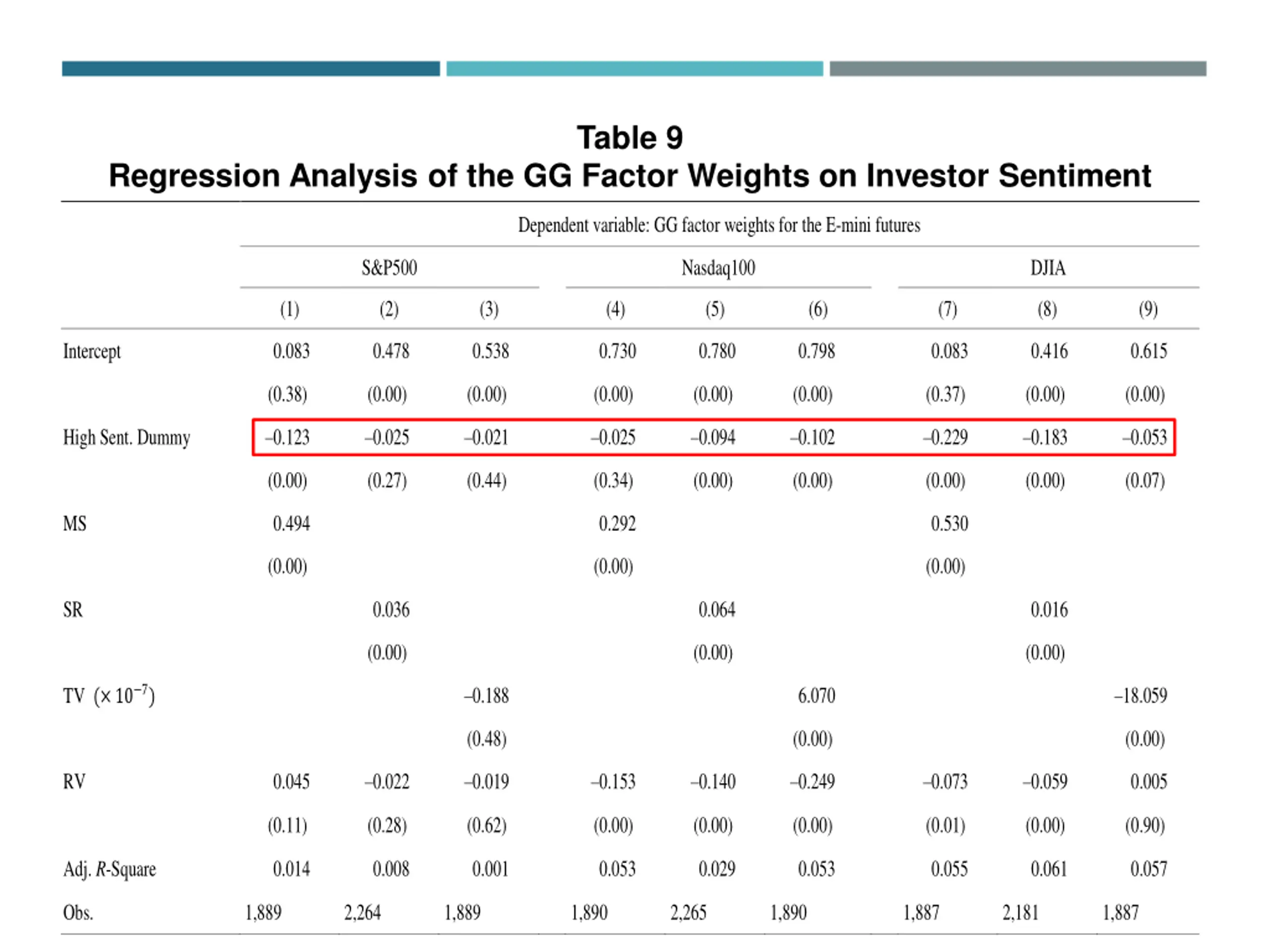 Table 9 Regression Analysis of the GG Factor Weights on Investor Sentiment Dependent variable: GG factor weights for the E-mini futures S&P500 Nasdaq100 DJIA (1) (2) (3) (4) (5) (6) (7) (8) (9) Intercept 0.083 0.478 0.538 0.730 0.780 0.798 0.083 0.416 0.615 (0.38) (0.00) (0.00) (0.00) (0.00) (0.00) (0.37) (0.00) (0.00) High Sent. Dummy 0.123 0.025 0.021 0.025 0.094 0.102 0.229 0.183 0.053 (0.00) (0.27) (0.44) (0.34) (0.00) (0.00) (0.00) (0.00) (0.07) MS 0.494 0.292 0.530 (0.00) (0.00) (0.00) SR 0.036 0.064 0.016 (0.00) (0.00) (0.00) 0.188 6.070 18.059 TV ( 10 7) (0.48) (0.00) (0.00) RV 0.045 0.022 0.019 0.153 0.140 0.249 0.073 0.059 0.005 (0.11) (0.28) (0.62) (0.00) (0.00) (0.00) (0.01) (0.00) (0.90) Adj. R-Square 0.014 0.008 0.001 0.053 0.029 0.053 0.055 0.061 0.057 Obs. 1,889 2,264 1,889 1,890 2,265 1,890 1,887 2,181 1,887