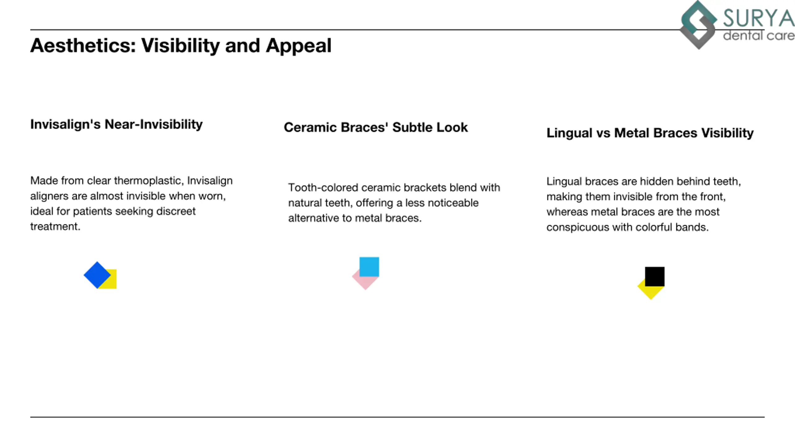 Aesthetics: Visibility and Appeal Invisalign's Near-Invisibility Ceramic Braces' Subtle Look Lingual vs Metal Braces Visibility Made from clear thermoplastic, Invisalign aligners are almost invisible when worn, ideal for patients seeking discreet treatment. Lingual braces are hidden behind teeth, making them invisible from the front, whereas metal braces are the most conspicuous with colorful bands. Tooth-colored ceramic brackets blend with natural teeth, offering a less noticeable alternative to metal braces.