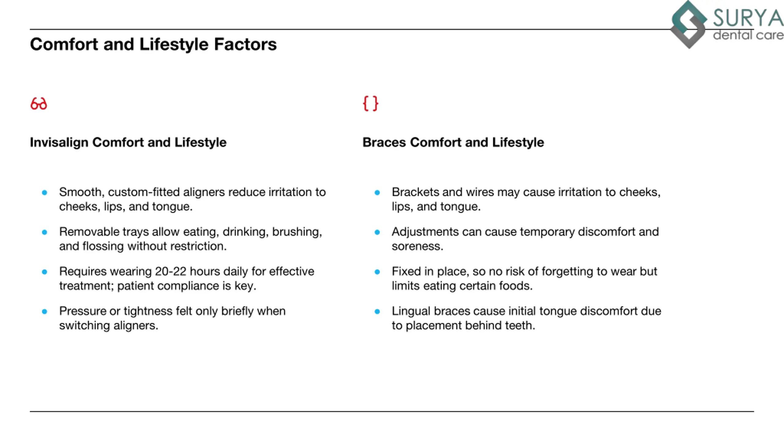 Comfort and Lifestyle Factors Invisalign Comfort and Lifestyle Braces Comfort and Lifestyle Smooth, custom-fitted aligners reduce irritation to cheeks, lips, and tongue. Brackets and wires may cause irritation to cheeks, lips, and tongue. Removable trays allow eating, drinking, brushing, and flossing without restriction. Adjustments can cause temporary discomfort and soreness. Requires wearing 20-22 hours daily for effective treatment; patient compliance is key. Fixed in place, so no risk of forgetting to wear but limits eating certain foods. Pressure or tightness felt only briefly when switching aligners. Lingual braces cause initial tongue discomfort due to placement behind teeth.