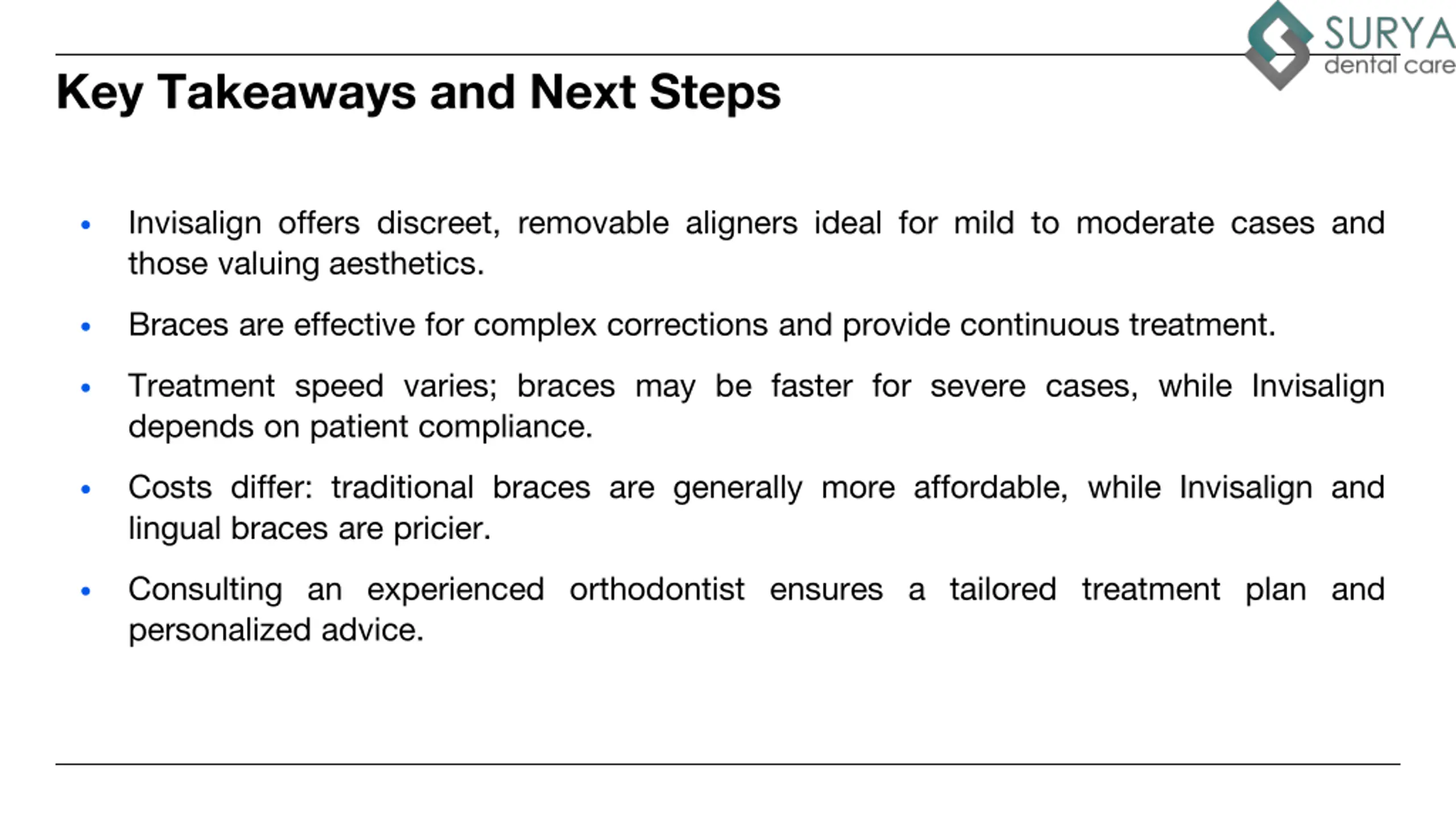 Key Takeaways and Next Steps Invisalign offers discreet, removable aligners ideal for mild to moderate cases and those valuing aesthetics. Braces are effective for complex corrections and provide continuous treatment. Treatment speed varies; braces may be faster for severe cases, while Invisalign depends on patient compliance. Costs differ: traditional braces are generally more affordable, while Invisalign and lingual braces are pricier. Consulting an experienced orthodontist ensures a tailored treatment plan and personalized advice.