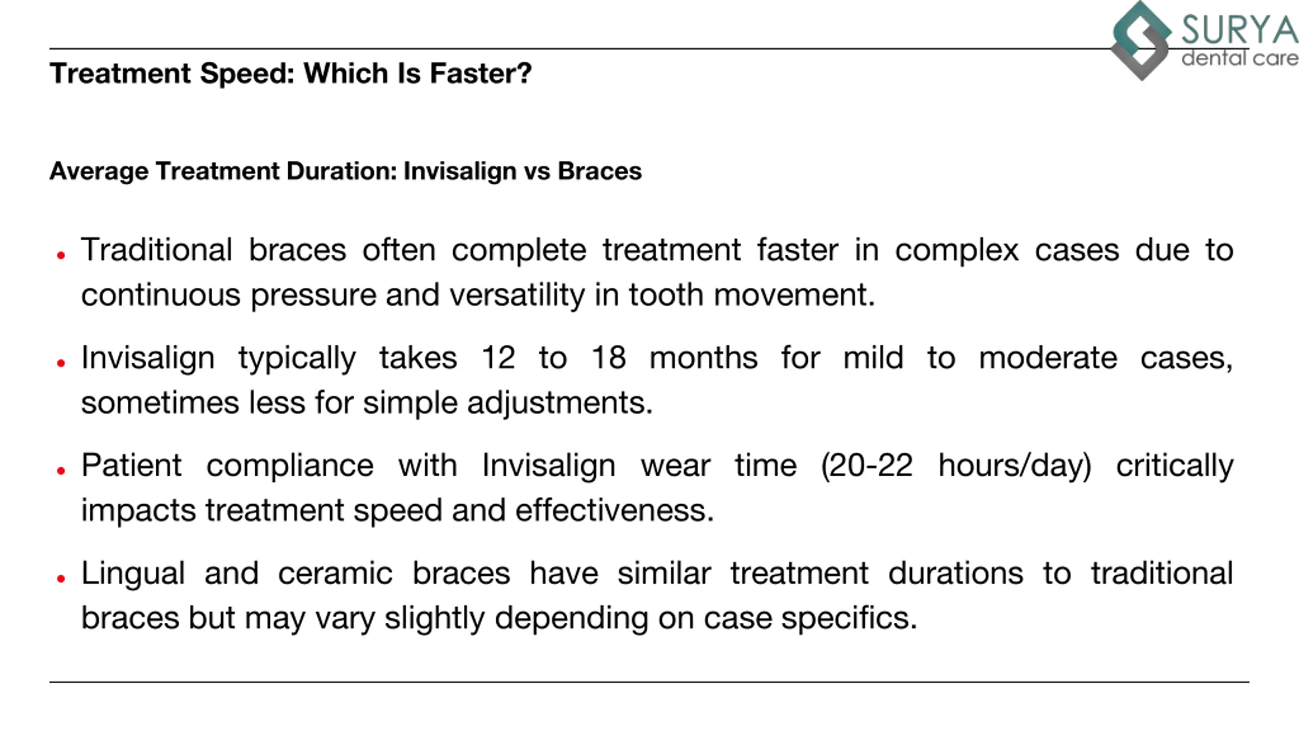 Treatment Speed: Which Is Faster? Average Treatment Duration: Invisalign vs Braces Traditional braces often complete treatment faster in complex cases due to continuous pressure and versatility in tooth movement. Invisalign typically takes 12 to 18 months for mild to moderate cases, sometimes less for simple adjustments. Patient compliance with Invisalign wear time (20-22 hours/day) critically impacts treatment speed and effectiveness. Lingual and ceramic braces have similar treatment durations to traditional braces but may vary slightly depending on case specifics.