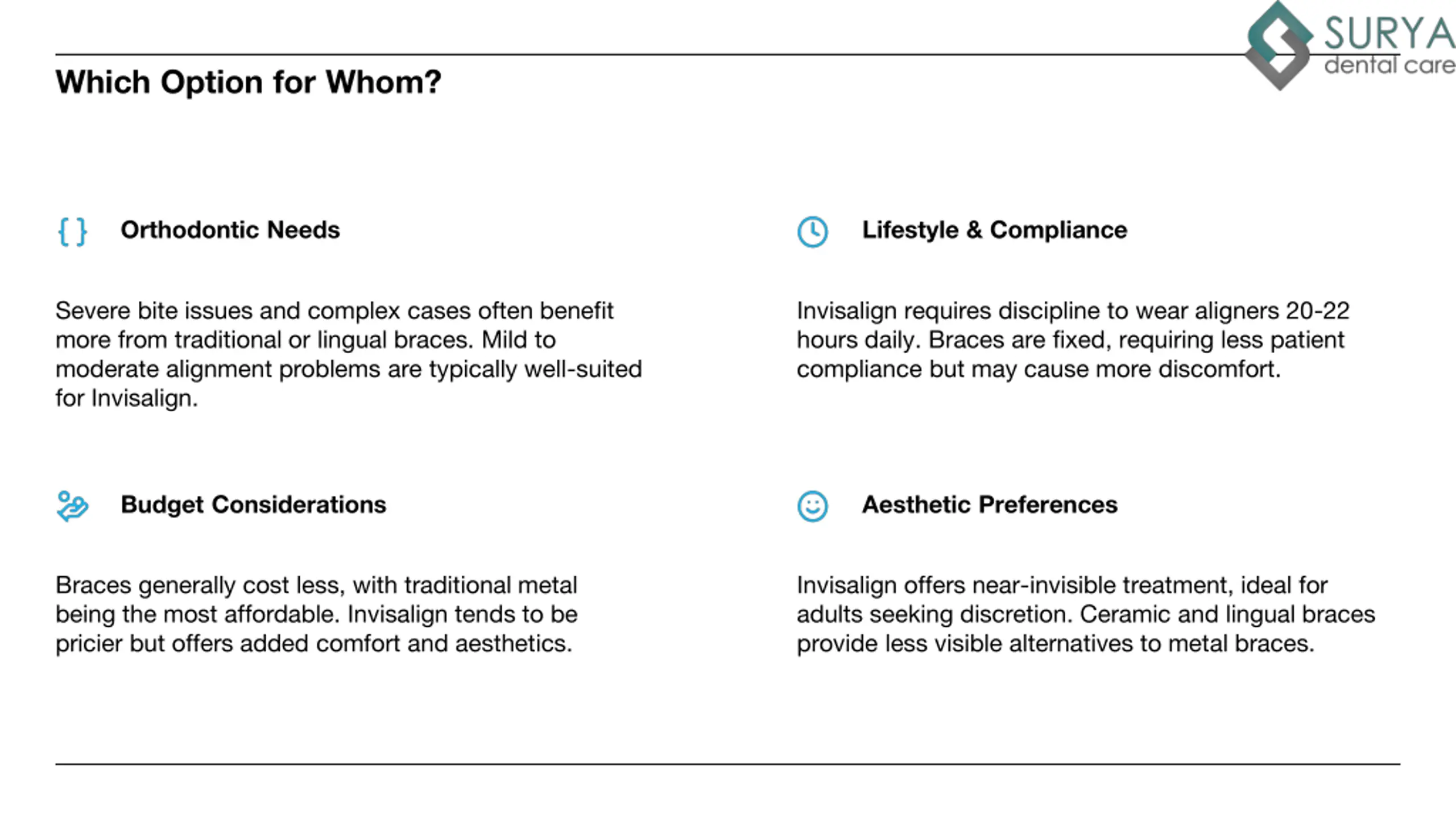 Which Option for Whom? Orthodontic Needs Lifestyle & Compliance Severe bite issues and complex cases often benefit more from traditional or lingual braces. Mild to moderate alignment problems are typically well-suited for Invisalign. Invisalign requires discipline to wear aligners 20-22 hours daily. Braces are fixed, requiring less patient compliance but may cause more discomfort. Budget Considerations Aesthetic Preferences Braces generally cost less, with traditional metal being the most affordable. Invisalign tends to be pricier but offers added comfort and aesthetics. Invisalign offers near-invisible treatment, ideal for adults seeking discretion. Ceramic and lingual braces provide less visible alternatives to metal braces.