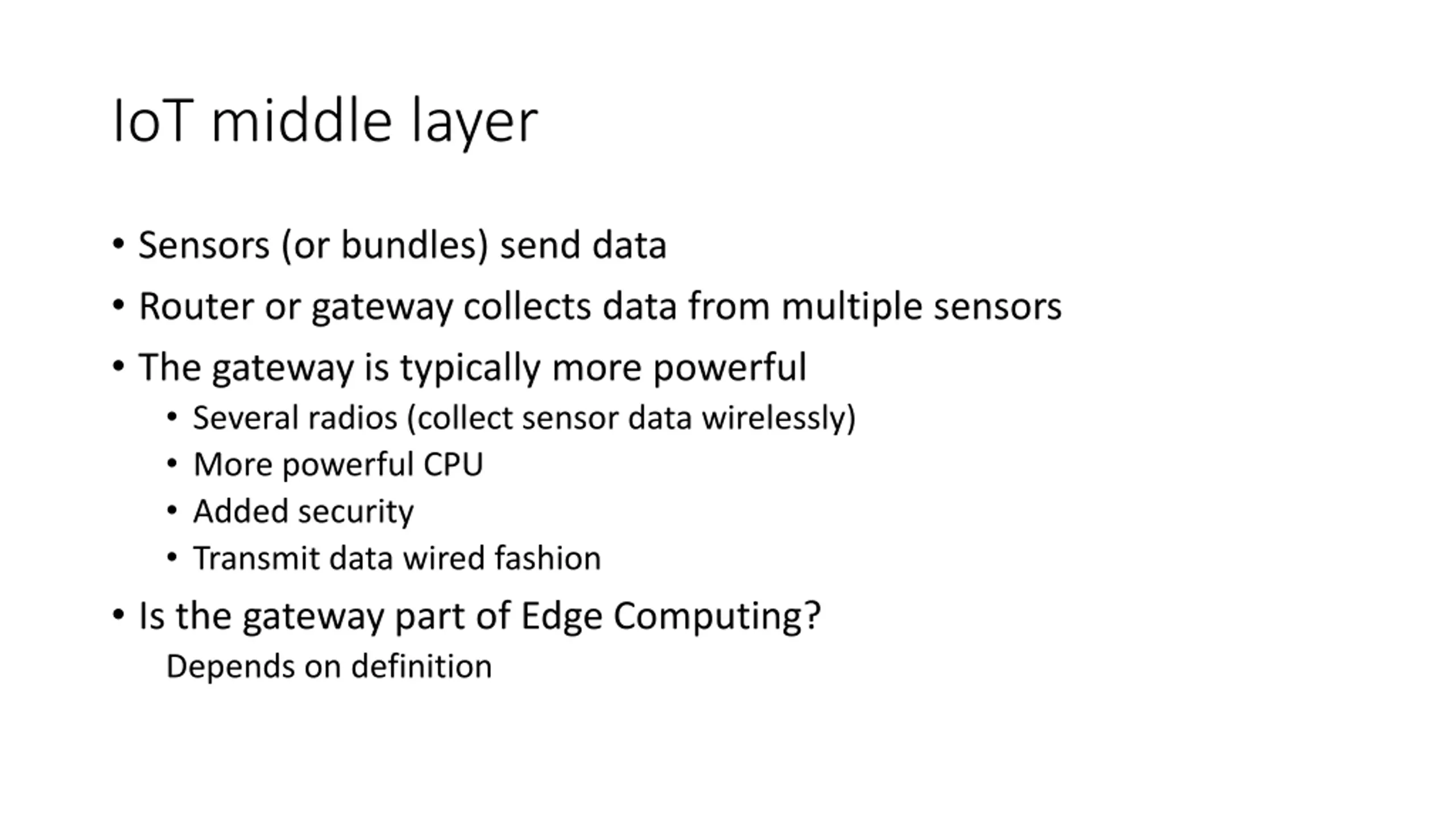 IoT middle layer Sensors (or bundles) send data Router or gateway collects data from multiple sensors The gateway is typically more powerful Several radios (collect sensor data wirelessly) More powerful CPU Added security Transmit data wired fashion Is the gateway part of Edge Computing? Depends on definition