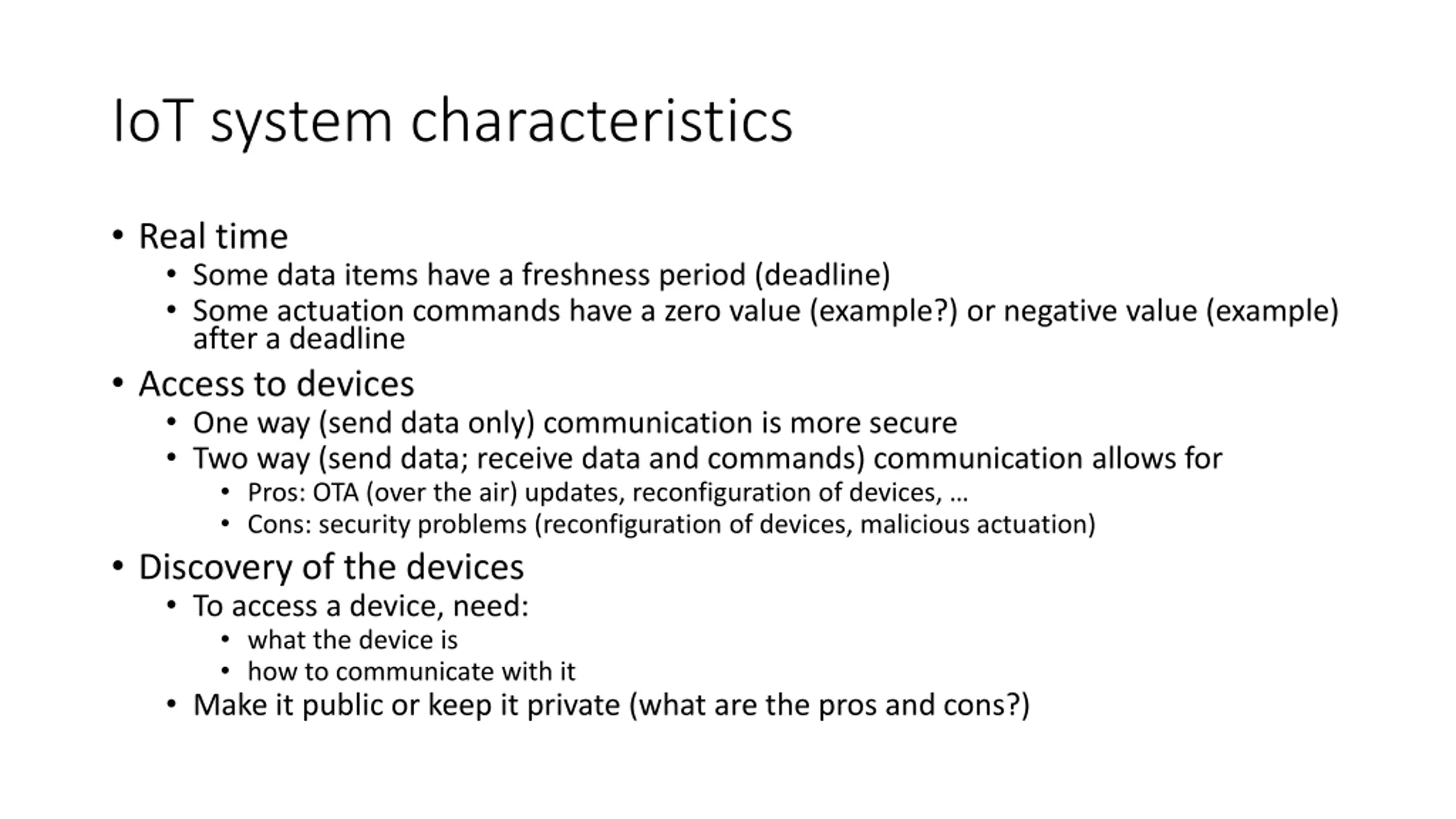 IoT system characteristics Real time Some data items have a freshness period (deadline) Some actuation commands have a zero value (example?) or negative value (example) after a deadline Access to devices One way (send data only) communication is more secure Two way (send data; receive data and commands) communication allows for Pros: OTA (over the air) updates, reconfiguration of devices, Cons: security problems (reconfiguration of devices, malicious actuation) Discovery of the devices To access a device, need: what the device is how to communicate with it Make it public or keep it private (what are the pros and cons?)