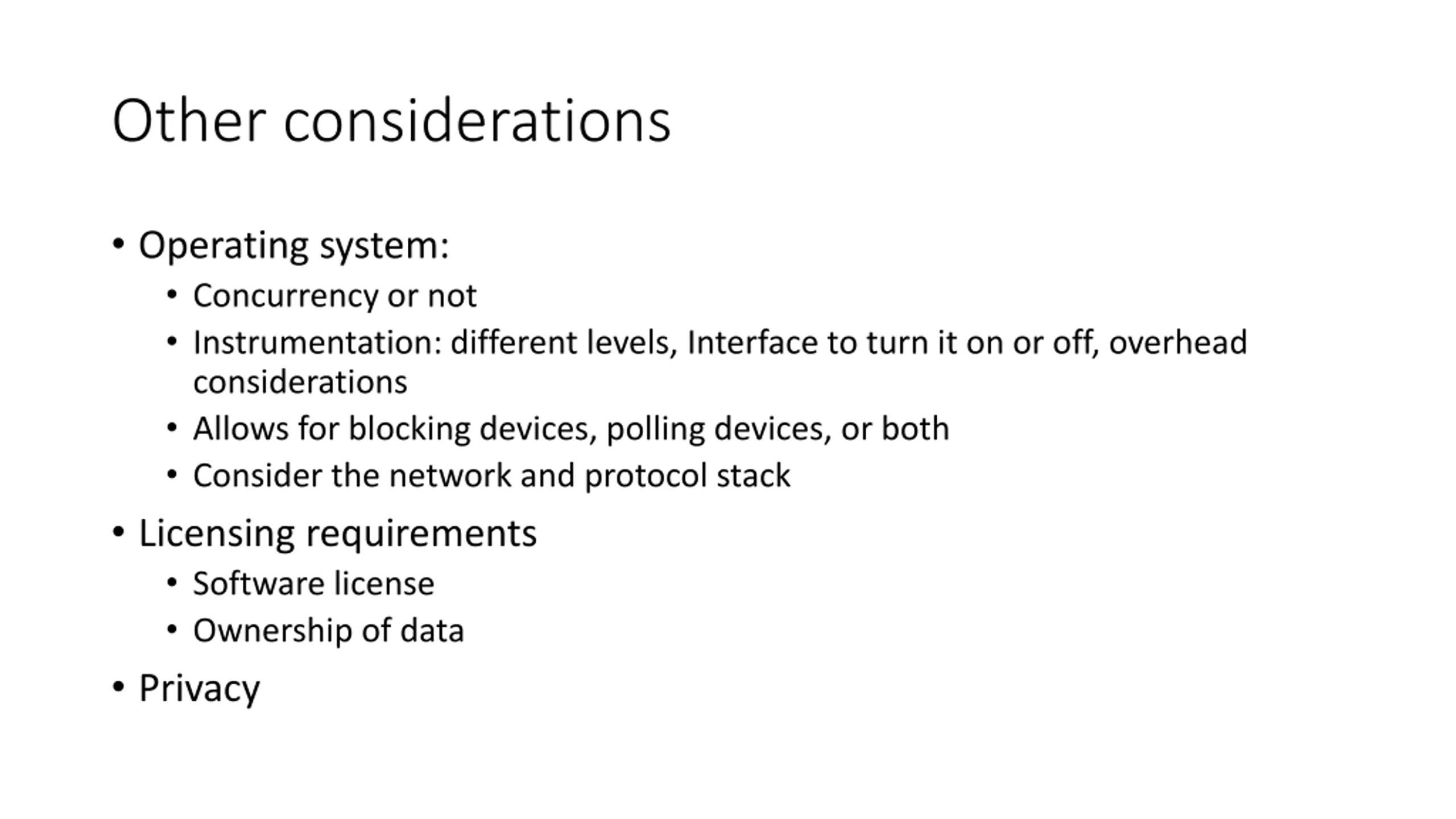 Other considerations Operating system: Concurrency or not Instrumentation: different levels, Interface to turn it on or off, overhead considerations Allows for blocking devices, polling devices, or both Consider the network and protocol stack Licensing requirements Software license Ownership of data Privacy