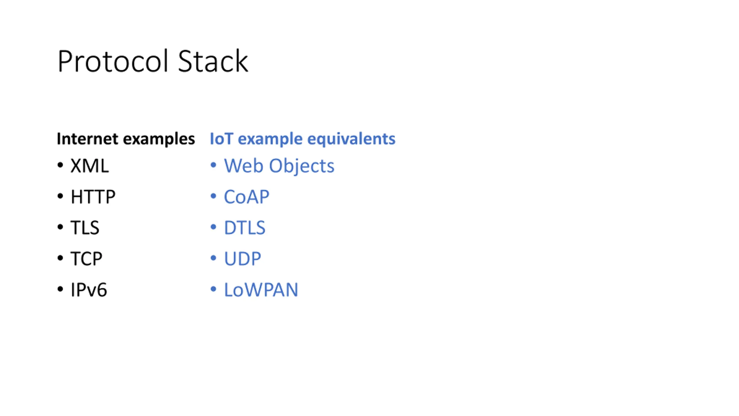 Protocol Stack Internet examples XML HTTP TLS TCP IPv6 IoT example equivalents Web Objects CoAP DTLS UDP LoWPAN