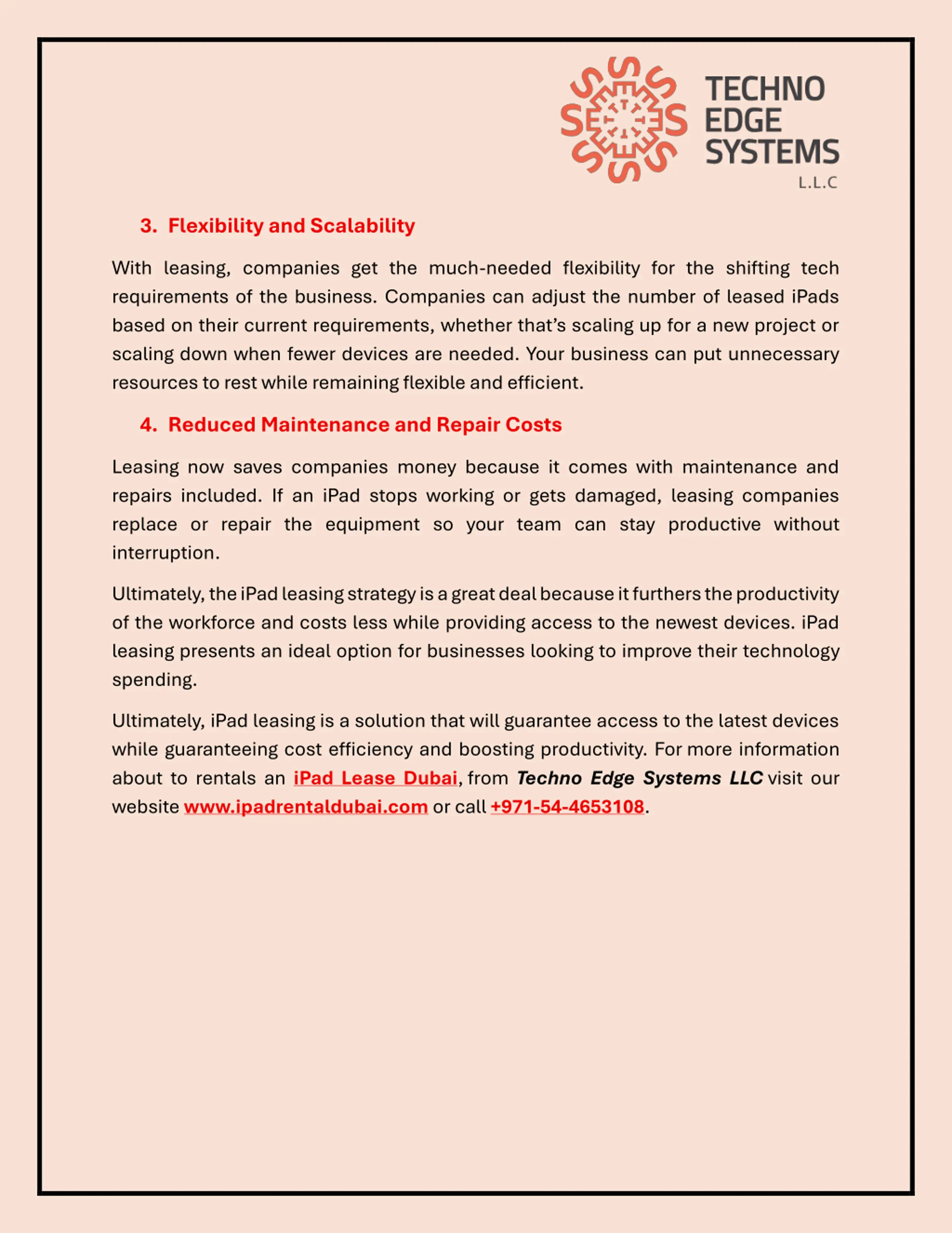 3.Flexibility and Scalability With leasing, companies get the much-needed flexibility for the shifting tech requirements of the business. Companies can adjust the number of leased iPads based on their current requirements, whether that s scaling up for a new project or scaling down when fewer devices are needed. Your business can put unnecessary resources to rest while remaining flexible and efficient. 4.Reduced Maintenance and Repair Costs Leasing now saves companies money because it comes with maintenance and repairs included. If an iPad stops working or gets damaged, leasing companies replace or repair the equipment so your team can stay productive without interruption. Ultimately, the iPad leasing strategy is a great deal because it furthers the productivity of the workforce and costs less while providing access to the newest devices. iPad leasing presents an ideal option for businesses looking to improve their technology spending. Ultimately, iPad leasing is a solution that will guarantee access to the latest devices while guaranteeing cost efficiency and boosting productivity. Formore information about to rentals an iPad Lease Dubai,from Techno Edge Systems LLCvisit our websitewww.ipadrentaldubai.comor call+971-54-4653108.