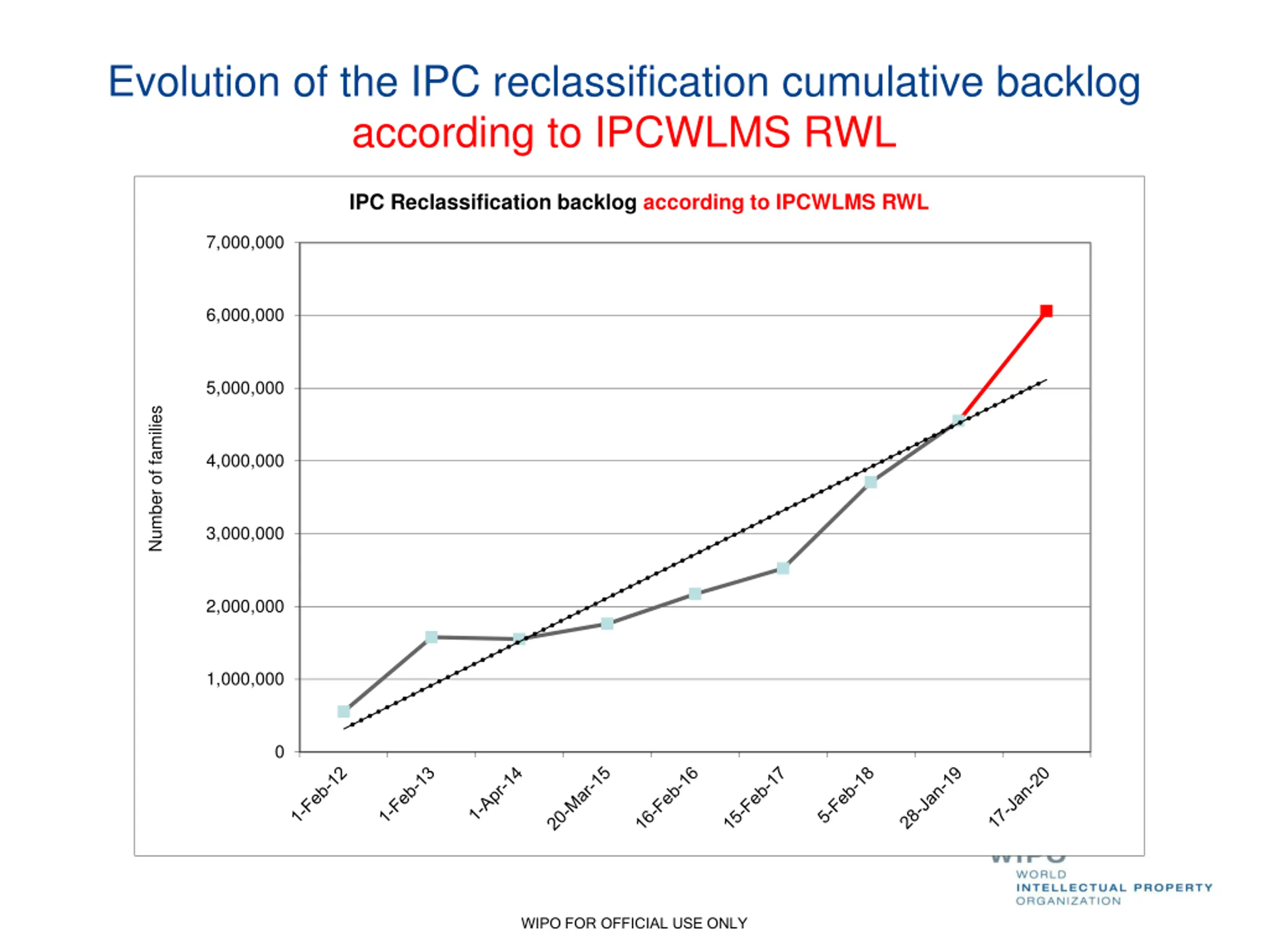 Evolution of the IPC reclassification cumulative backlog according to IPCWLMS RWL IPC Reclassification backlog according to IPCWLMS RWL 7,000,000 6,000,000 5,000,000 Number of families 4,000,000 3,000,000 2,000,000 1,000,000 0 WIPO FOR OFFICIAL USE ONLY