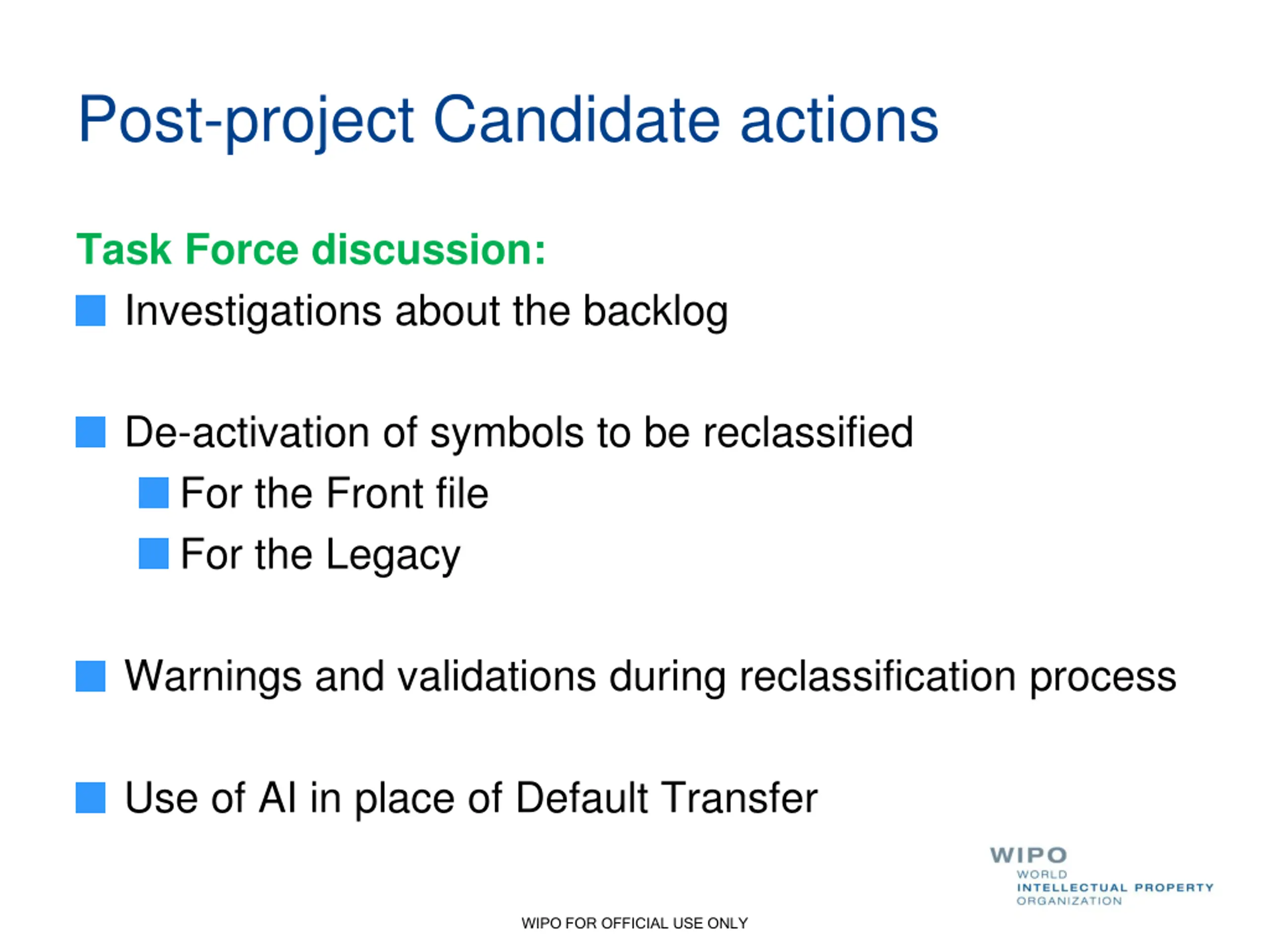 Post-project Candidate actions Task Force discussion: Investigations about the backlog De-activation of symbols to be reclassified For the Front file For the Legacy Warnings and validations during reclassification process Use of AI in place of Default Transfer WIPO FOR OFFICIAL USE ONLY