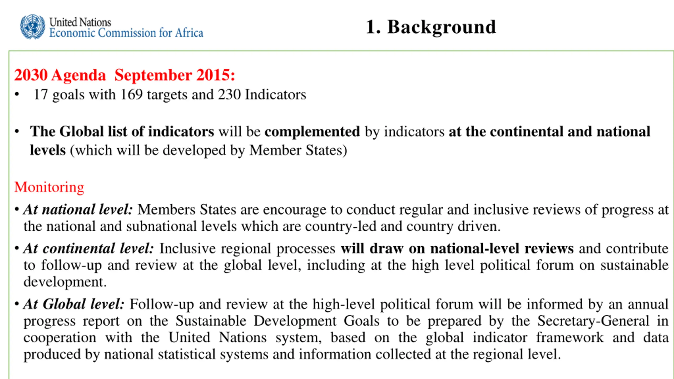 1. Background 2030 Agenda September 2015: 17 goals with 169 targets and 230 Indicators The Global list of indicators will be complemented by indicators at the continental and national levels (which will be developed by Member States) Monitoring At national level: Members States are encourage to conduct regular and inclusive reviews of progress at the national and subnational levels which are country-led and country driven. At continental level: Inclusive regional processes will draw on national-level reviews and contribute to follow-up and review at the global level, including at the high level political forum on sustainable development. At Global level: Follow-up and review at the high-level political forum will be informed by an annual progress report on the Sustainable Development Goals to be prepared by the Secretary-General in cooperation with the United Nations system, based on the global indicator framework and data produced by national statistical systems and information collected at the regional level.