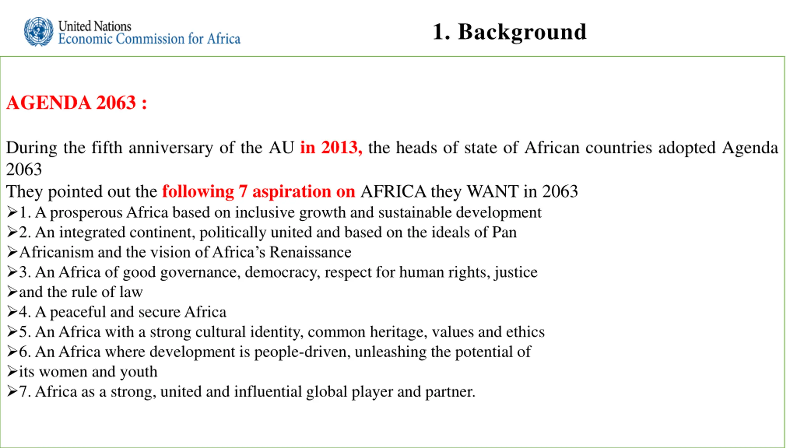 1. Background AGENDA 2063 : During the fifth anniversary of the AU in 2013, the heads of state of African countries adopted Agenda 2063 They pointed out the following 7 aspiration on AFRICA they WANT in 2063 1. A prosperous Africa based on inclusive growth and sustainable development 2. An integrated continent, politically united and based on the ideals of Pan Africanism and the vision of Africa s Renaissance 3. An Africa of good governance, democracy, respect for human rights, justice and the rule of law 4. A peaceful and secure Africa 5. An Africa with a strong cultural identity, common heritage, values and ethics 6. An Africa where development is people-driven, unleashing the potential of its women and youth 7. Africa as a strong, united and influential global player and partner.