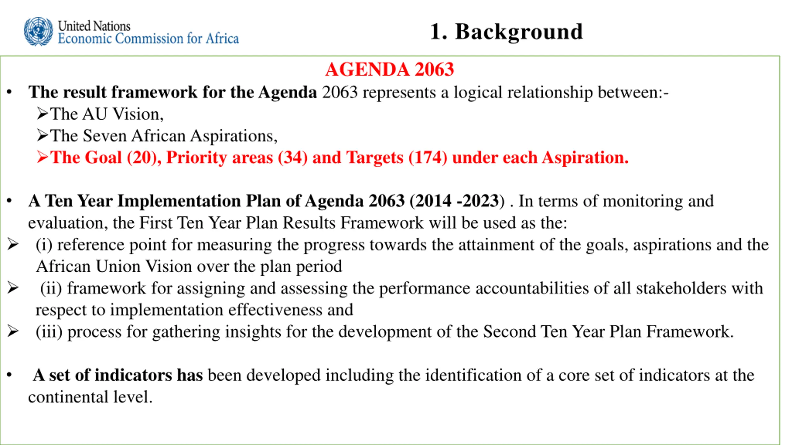 1. Background AGENDA 2063 The result framework for the Agenda 2063 represents a logical relationship between:- The AU Vision, The Seven African Aspirations, The Goal (20), Priority areas (34) and Targets (174) under each Aspiration. A Ten Year Implementation Plan of Agenda 2063 (2014 -2023) . In terms of monitoring and evaluation, the First Ten Year Plan Results Framework will be used as the: (i) reference point for measuring the progress towards the attainment of the goals, aspirations and the African Union Vision over the plan period (ii) framework for assigning and assessing the performance accountabilities of all stakeholders with respect to implementation effectiveness and (iii) process for gathering insights for the development of the Second Ten Year Plan Framework. A set of indicators has been developed including the identification of a core set of indicators at the continental level.