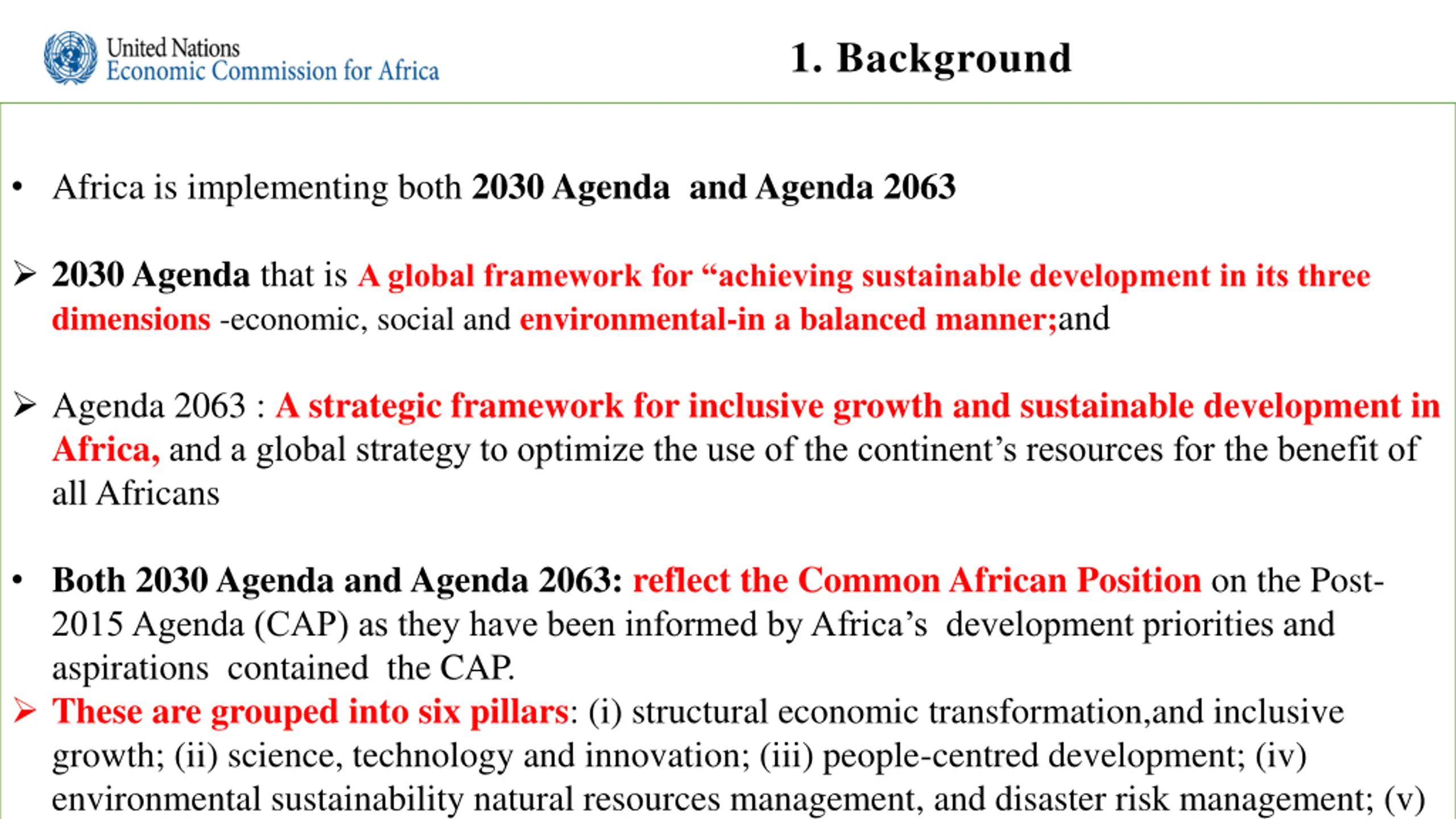 1. Background Africa is implementing both 2030 Agenda and Agenda 2063 2030 Agenda that is A global framework for achieving sustainable development in its three dimensions -economic, social and environmental-in a balanced manner;and Agenda 2063 : A strategic framework for inclusive growth and sustainable development in Africa,and a global strategy to optimize the use of the continent s resources for the benefit of all Africans Both 2030 Agenda and Agenda 2063: reflect the Common African Position on the Post- 2015 Agenda (CAP) as they have been informed by Africa s development priorities and aspirations contained the CAP. These are grouped into six pillars: (i) structural economic transformation,and inclusive growth; (ii) science, technology and innovation; (iii) people-centred development; (iv) environmental sustainability natural resources management, and disaster risk management; (v)