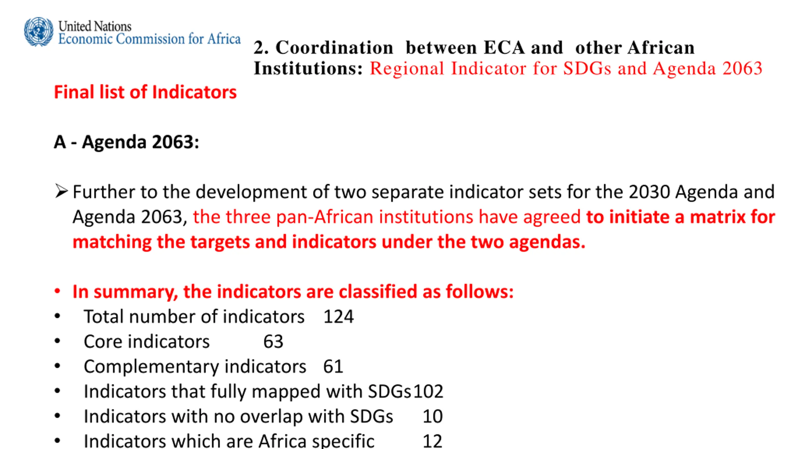 2. Coordination between ECA and other African Institutions: Regional Indicator for SDGs and Agenda 2063 Final list of Indicators A - Agenda 2063: Further to the development of two separate indicator sets for the 2030 Agenda and Agenda 2063, the three pan-African institutions have agreed to initiate a matrix for matching the targets and indicators under the two agendas. In summary, the indicators are classified as follows: Total number of indicators 124 Core indicators 63 Complementary indicators 61 Indicators that fully mapped with SDGs 102 Indicators with no overlap with SDGs 10 Indicators which are Africa specific 12