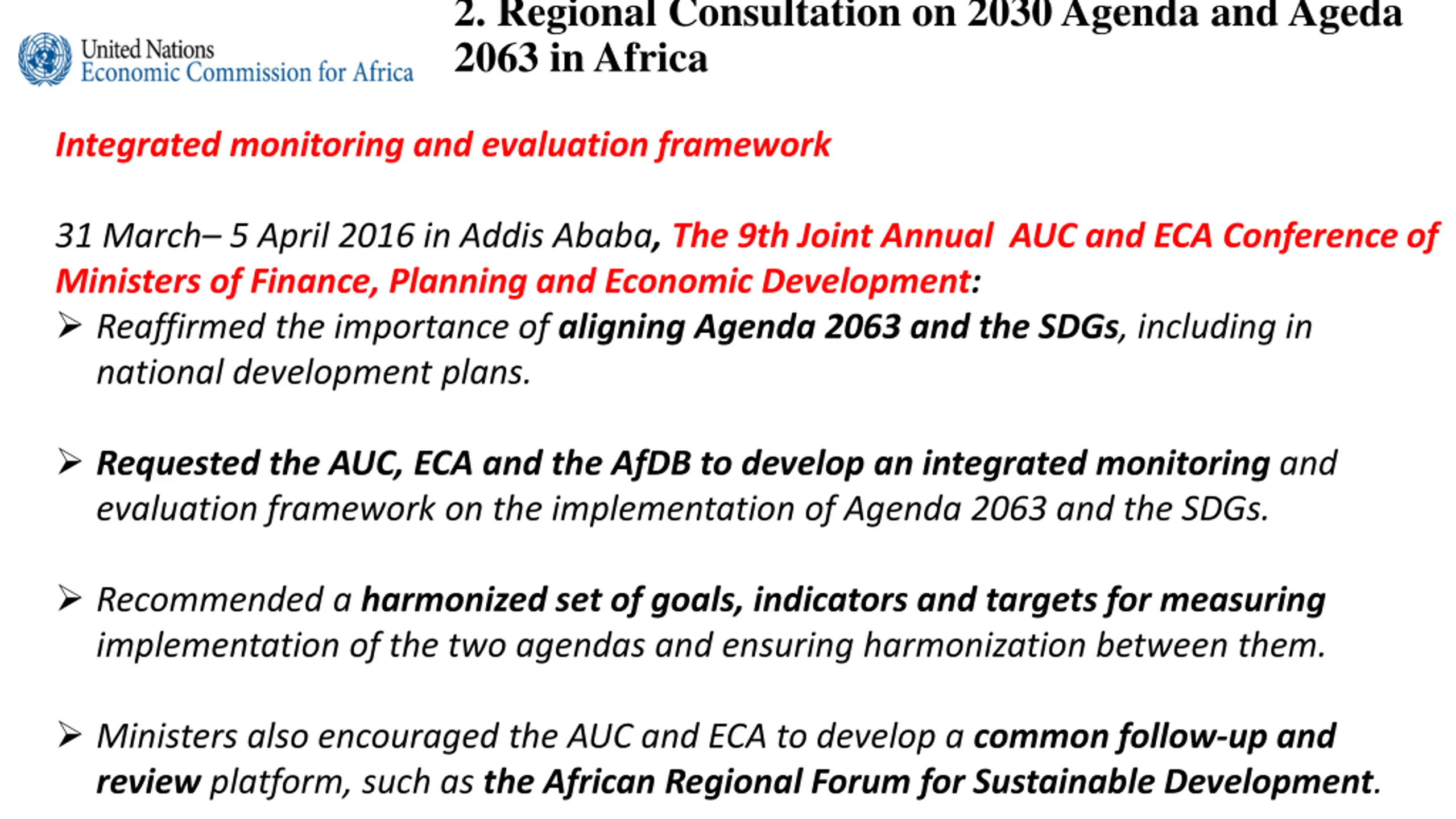 2. Regional Consultation on 2030 Agenda and Ageda 2063 in Africa Integrated monitoring and evaluation framework 31 March 5 April 2016 in Addis Ababa, The 9th Joint Annual AUC and ECA Conference of Ministers of Finance, Planning and Economic Development: Reaffirmed the importance of aligning Agenda 2063 and the SDGs, including in national development plans. Requested the AUC, ECA and the AfDB to develop an integrated monitoring and evaluation framework on the implementation of Agenda 2063 and the SDGs. Recommended a harmonized set of goals, indicators and targets for measuring implementation of the two agendas and ensuring harmonization between them. Ministers also encouraged the AUC and ECA to develop a common follow-up and review platform, such as the African Regional Forum for Sustainable Development.