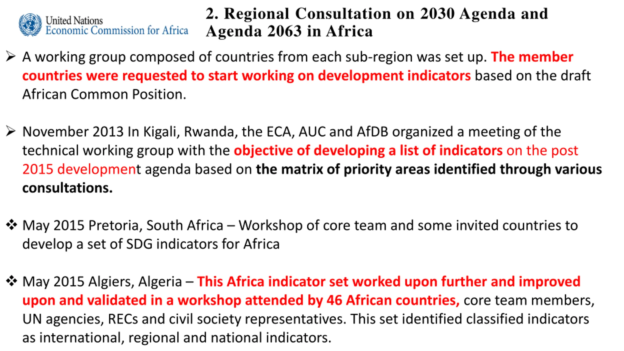 2. Regional Consultation on 2030 Agenda and Agenda 2063 in Africa A working group composed of countries from each sub-region was set up. The member countries were requested to start working on development indicators based on the draft African Common Position. November 2013 In Kigali, Rwanda, the ECA, AUC and AfDB organized a meeting of the technical working group with the objective of developing a list of indicators on the post 2015 development agenda based on the matrix of priority areas identified through various consultations. May 2015 Pretoria, South Africa Workshop of core team and some invited countries to develop a set of SDG indicators for Africa May 2015 Algiers, Algeria This Africa indicator set worked upon further and improved upon and validated in a workshop attended by 46 African countries, core team members, UN agencies, RECs and civil society representatives. This set identified classified indicators as international, regional and national indicators.