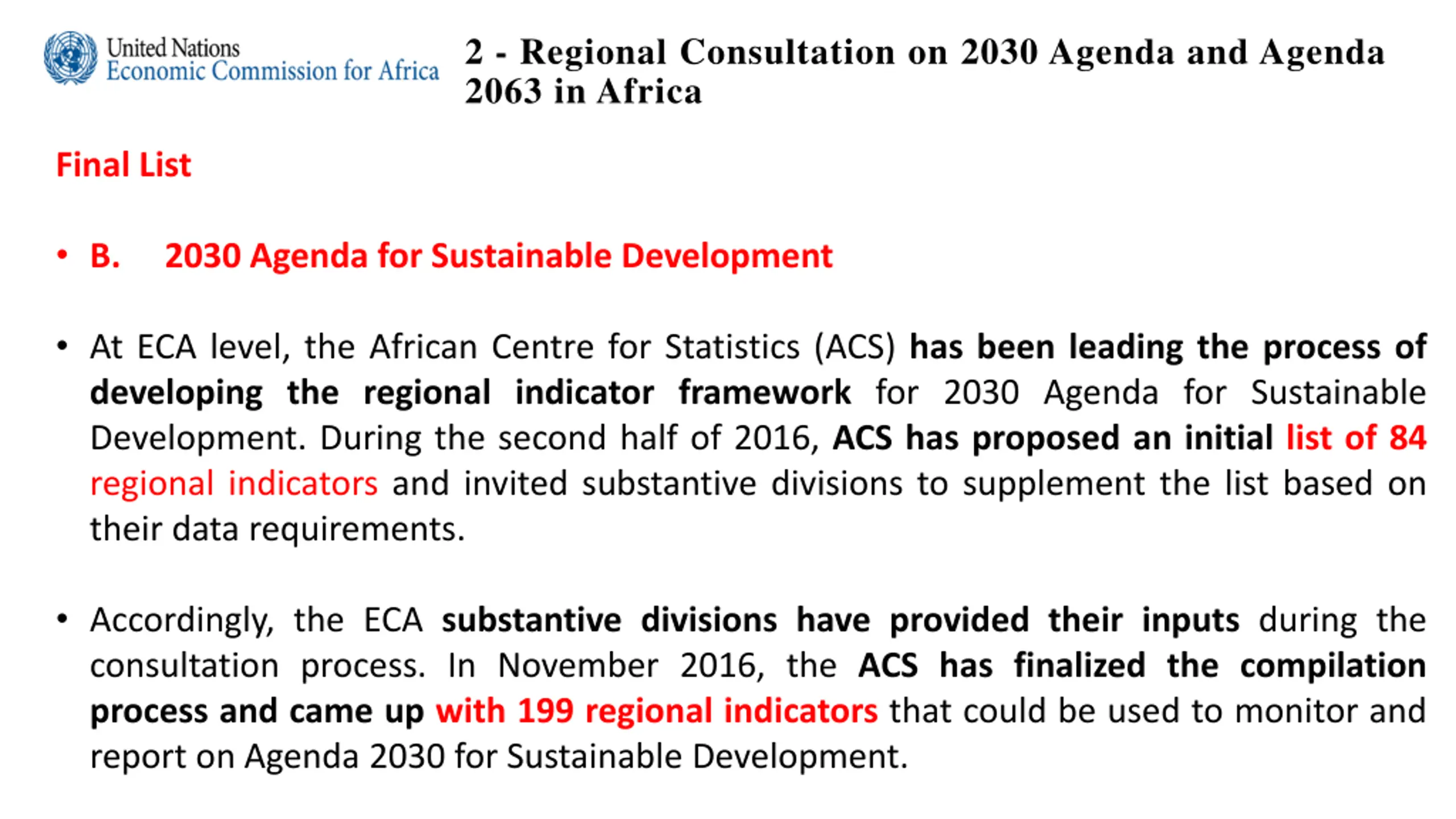 2 - Regional Consultation on 2030 Agenda and Agenda 2063 in Africa Final List B. 2030 Agenda for Sustainable Development At ECA level, the African Centre for Statistics (ACS) has been leading the process of developing the regional indicator framework for 2030 Agenda for Sustainable Development. During the second half of 2016, ACShas proposed an initial list of 84 regional indicators and invited substantive divisions to supplement the list based on their data requirements. Accordingly, the ECA substantive divisions have provided their inputs during the consultation process. In November 2016, the ACS has finalized the compilation process and came up with 199 regional indicators that could be used to monitor and report on Agenda 2030 for Sustainable Development.