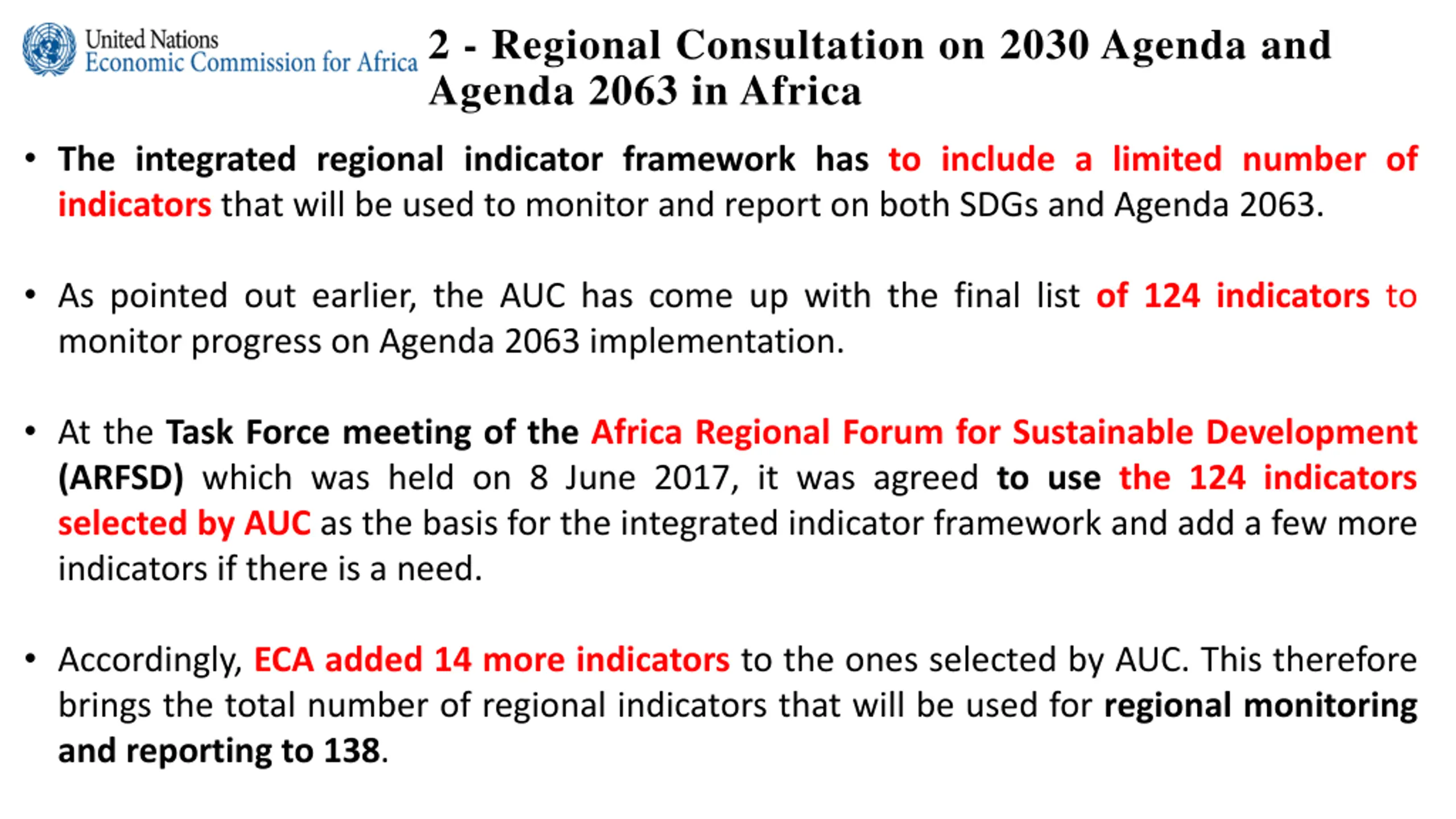 2 - Regional Consultation on 2030 Agenda and Agenda 2063 in Africa The integrated regional indicator framework has to include a limited number of indicators that will be used to monitor and report on both SDGs and Agenda 2063. As pointed out earlier, the AUC has come up with the final list of 124 indicators to monitor progress on Agenda 2063 implementation. At the Task Force meeting of the Africa Regional Forum for Sustainable Development (ARFSD) which was held on 8 June 2017, it was agreed to use the 124 indicators selected by AUC as the basis for the integrated indicator framework and add a few more indicators if there is a need. Accordingly, ECA added 14 more indicators to the ones selected by AUC. This therefore brings the total number of regional indicators that will be used for regional monitoring and reporting to 138.