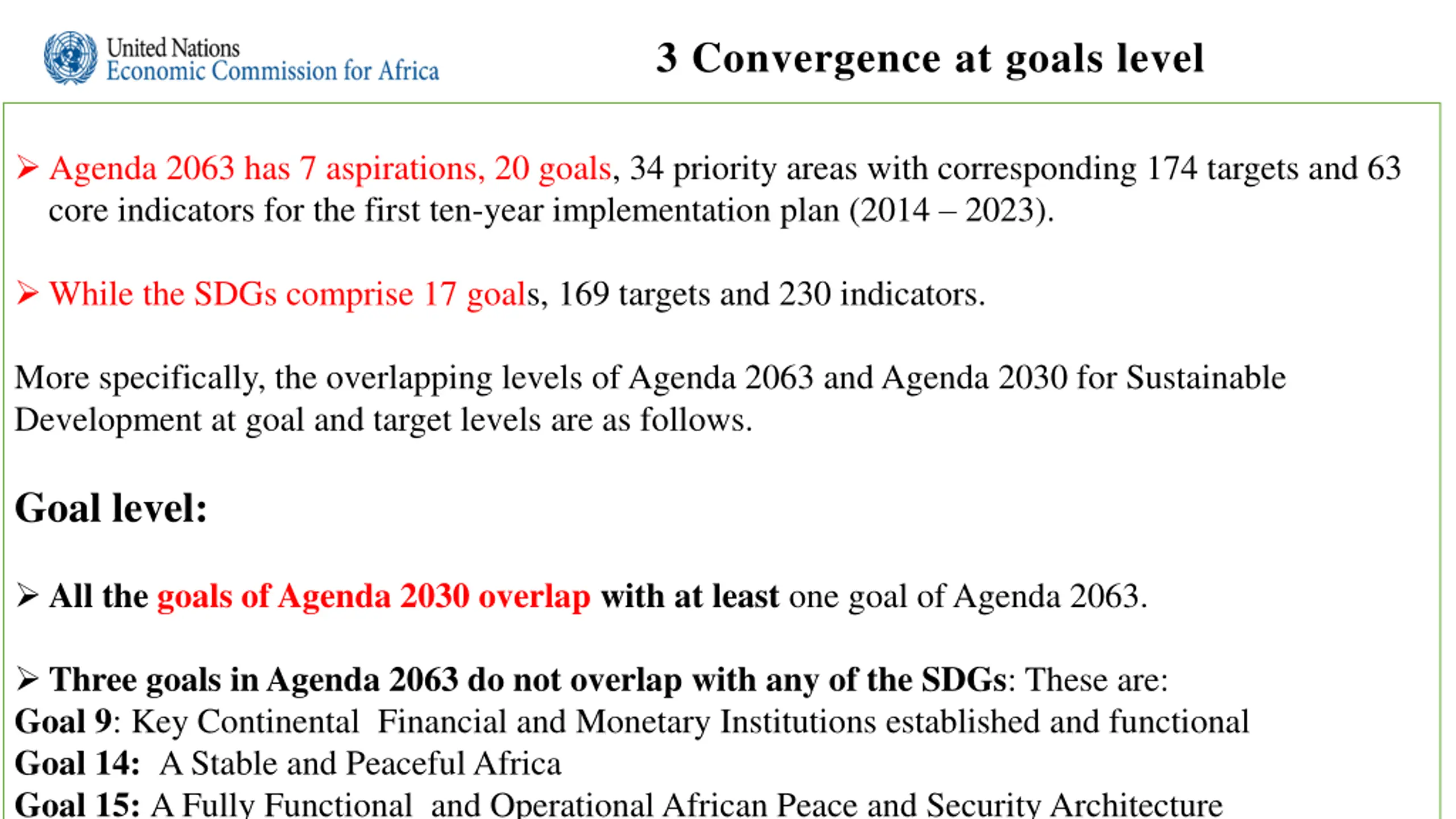 3 Convergence at goals level Agenda 2063 has 7 aspirations, 20 goals, 34 priority areas with corresponding 174 targets and 63 core indicators for the first ten-year implementation plan (2014 2023). While the SDGs comprise 17 goals, 169 targets and 230 indicators. More specifically, the overlapping levels of Agenda 2063 and Agenda 2030 for Sustainable Development at goal and target levels are as follows. Goal level: All the goals of Agenda 2030 overlap with at least one goal of Agenda 2063. Three goals in Agenda 2063 do not overlap with any of the SDGs: These are: Goal 9: Key Continental Financial and Monetary Institutions established and functional Goal 14: A Stable and Peaceful Africa Goal 15: A Fully Functional and Operational African Peace and Security Architecture