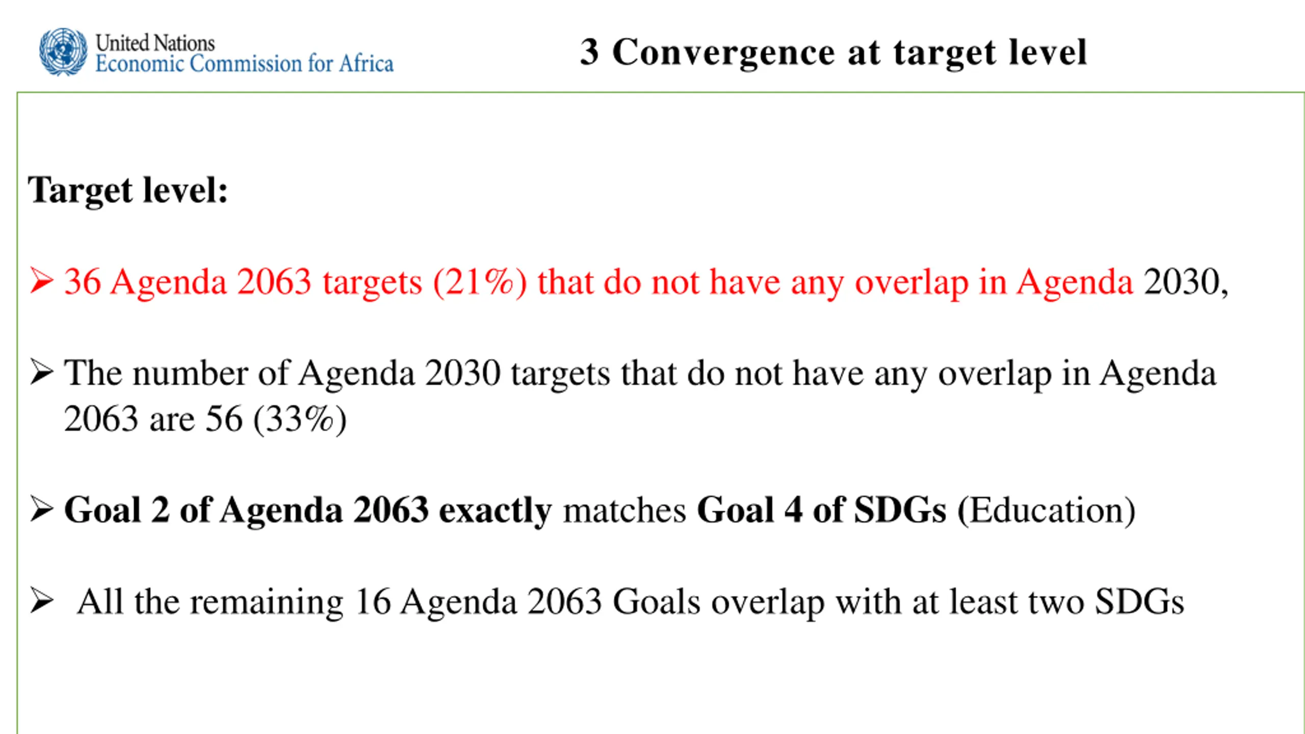 3 Convergence at target level Target level: 36 Agenda 2063 targets (21%) that do not have any overlap in Agenda 2030, The number of Agenda 2030 targets that do not have any overlap in Agenda 2063 are 56 (33%) Goal 2 of Agenda 2063 exactly matches Goal 4 of SDGs (Education) All the remaining 16 Agenda 2063 Goals overlap with at least two SDGs