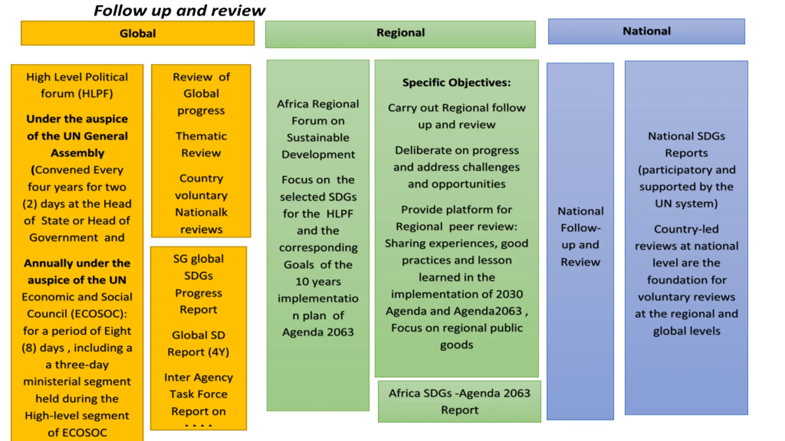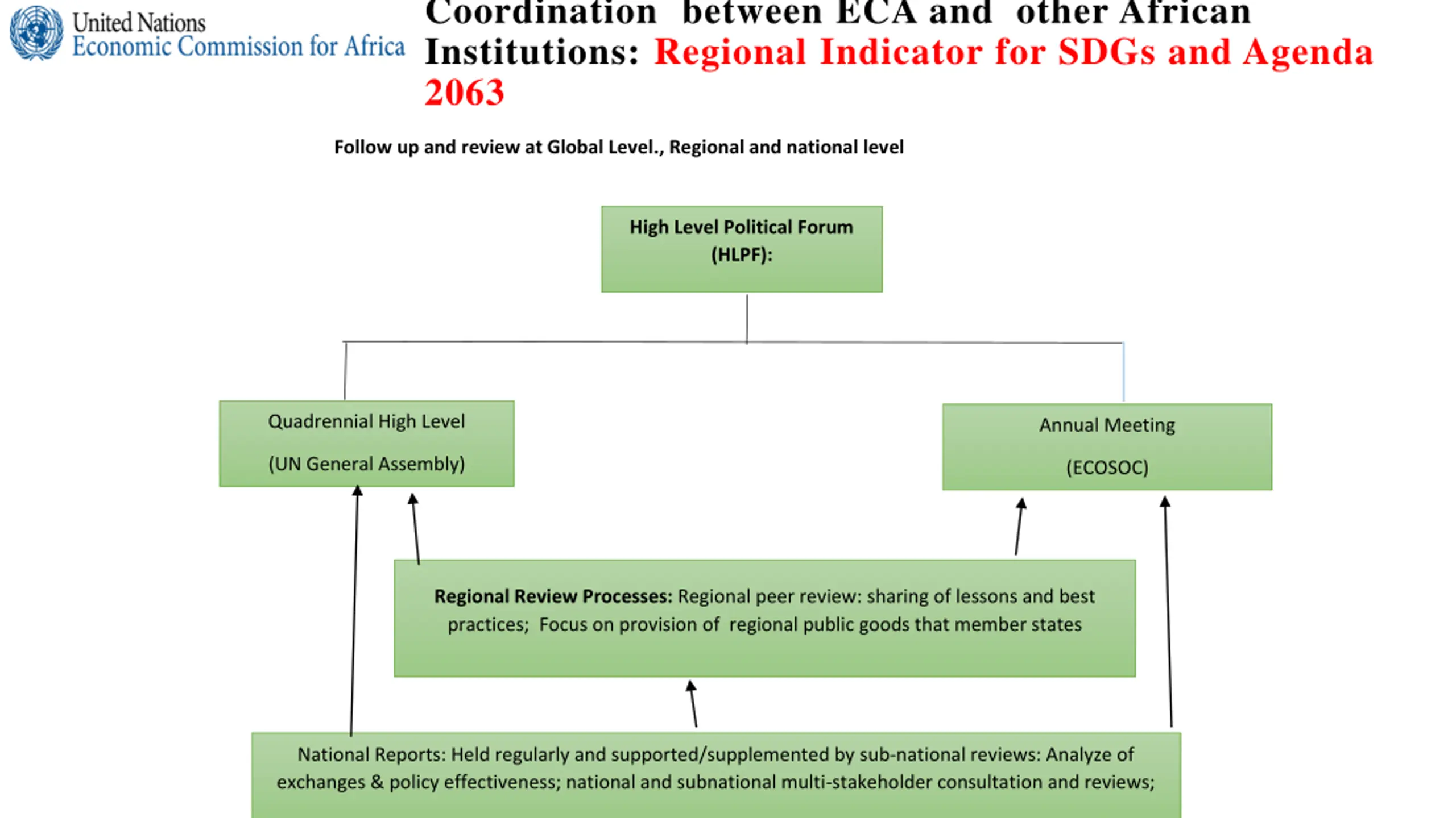 Coordination between ECA and other African Institutions: Regional Indicator for SDGs and Agenda 2063 Follow up and review at Global Level., Regional and national level High Level Political Forum (HLPF): Quadrennial High Level Annual Meeting (UN General Assembly) (ECOSOC) Regional Review Processes: Regional peer review: sharing of lessons and best practices; Focus on provision of regional public goods that member states National Reports: Held regularly and supported/supplemented by sub-national reviews: Analyze of exchanges & policy effectiveness; national and subnational multi-stakeholder consultation and reviews;
