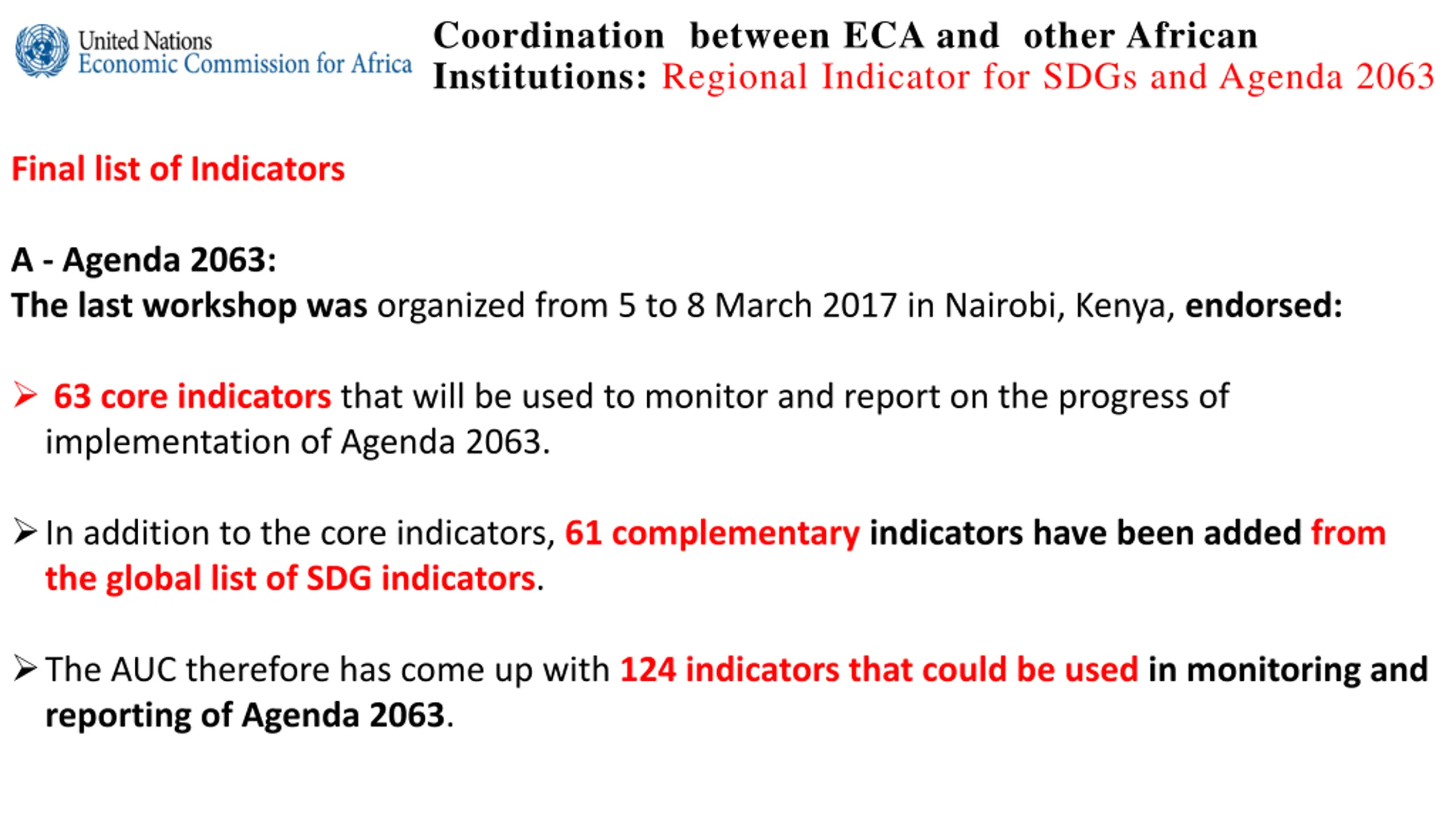 Coordination between ECA and other African Institutions: Regional Indicator for SDGs and Agenda 2063 Final list of Indicators A - Agenda 2063: The last workshop was organized from 5 to 8 March 2017 in Nairobi, Kenya, endorsed: 63 core indicators that will be used to monitor and report on the progress of implementation of Agenda 2063. In addition to the core indicators, 61 complementary indicators have been added from the global list of SDG indicators. The AUC therefore has come up with 124 indicators that could be used in monitoring and reporting of Agenda 2063.