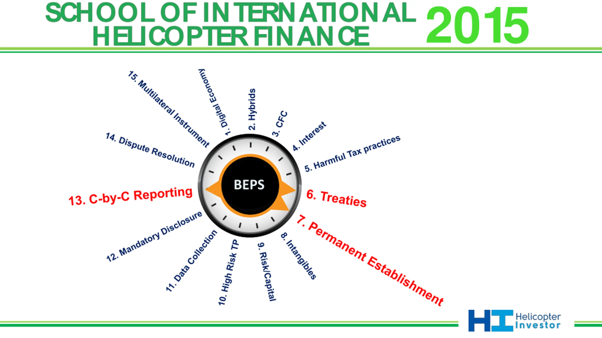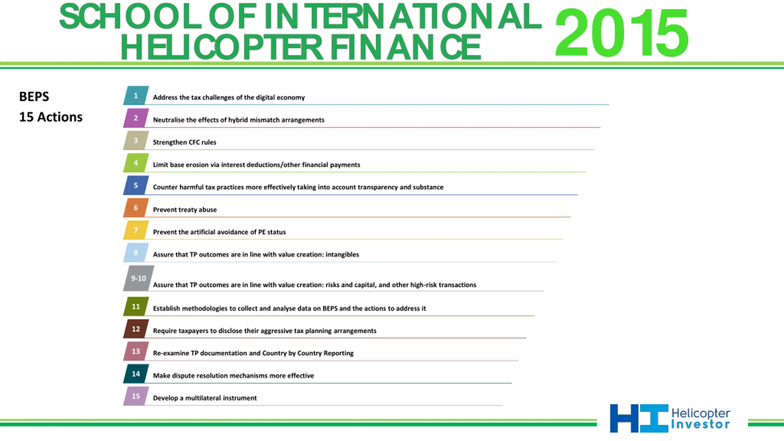 2015 BEPS 15 Actions 1 Address the tax challenges of the digital economy 2 Neutralise the effects of hybrid mismatch arrangements 3 Strengthen CFC rules 4 Limit base erosion via interest deductions/other financial payments 5 Counter harmful tax practices more effectively taking into account transparency and substance 6 Prevent treaty abuse 7 Prevent the artificial avoidance of PE status 8 Assure that TP outcomes are in line with value creation: intangibles 9-10 Assure that TP outcomes are in line with value creation: risks and capital, and other high-risk transactions 11 Establish methodologies to collect and analyse data on BEPS and the actions to address it 12 Require taxpayers to disclose their aggressive tax planning arrangements 13 Re-examine TP documentation and Country by Country Reporting 14 Make dispute resolution mechanisms more effective 15 Develop a multilateral instrument