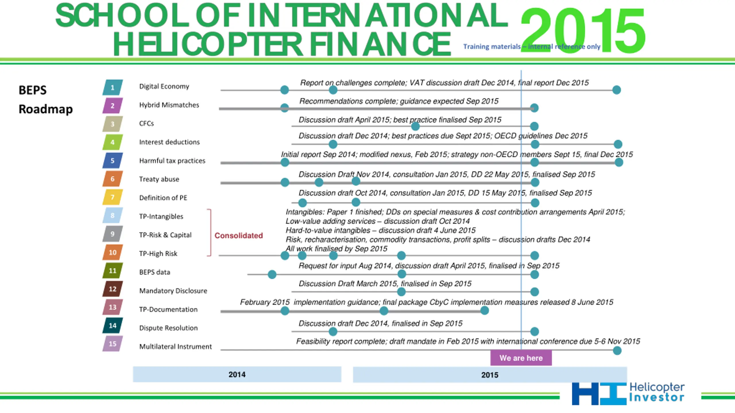 2015 Training materials internal reference only Report on challenges complete; VAT discussion draft Dec 2014, final report Dec 2015 Digital Economy BEPS Roadmap 1 Recommendations complete; guidance expected Sep 2015 Hybrid Mismatches 2 Discussion draft April 2015; best practice finalised Sep 2015 CFCs 3 Discussion draft Dec 2014; best practices due Sept 2015; OECD guidelines Dec 2015 Interest deductions 4 Initial report Sep 2014; modified nexus, Feb 2015; strategy non-OECD members Sept 15, final Dec 2015 5 Harmful tax practices Discussion Draft Nov 2014, consultation Jan 2015, DD 22 May 2015, finalised Sep 2015 6 Treaty abuse Discussion draft Oct 2014, consultation Jan 2015, DD 15 May 2015, finalised Sep 2015 7 Definition of PE Intangibles: Paper 1 finished; DDs on special measures & cost contribution arrangements April 2015; Low-value adding services discussion draft Oct 2014 Hard-to-value intangibles discussion draft 4 June 2015 Risk, recharacterisation, commodity transactions, profit splits discussion drafts Dec 2014 All work finalised by Sep 2015 8 TP-Intangibles 9 Consolidated TP-Risk & Capital 10 TP-High Risk Request for input Aug 2014, discussion draft April 2015, finalised in Sep 2015 11 BEPS data Discussion Draft March 2015, finalised in Sep 2015 12 Mandatory Disclosure February 2015 implementation guidance; final package CbyC implementation measures released 8 June 2015 13 TP-Documentation Discussion draft Dec 2014, finalised in Sep 2015 14 Dispute Resolution Feasibility report complete; draft mandate in Feb 2015 with international conference due 5-6 Nov 2015 15 Multilateral Instrument We are here 2014 2015
