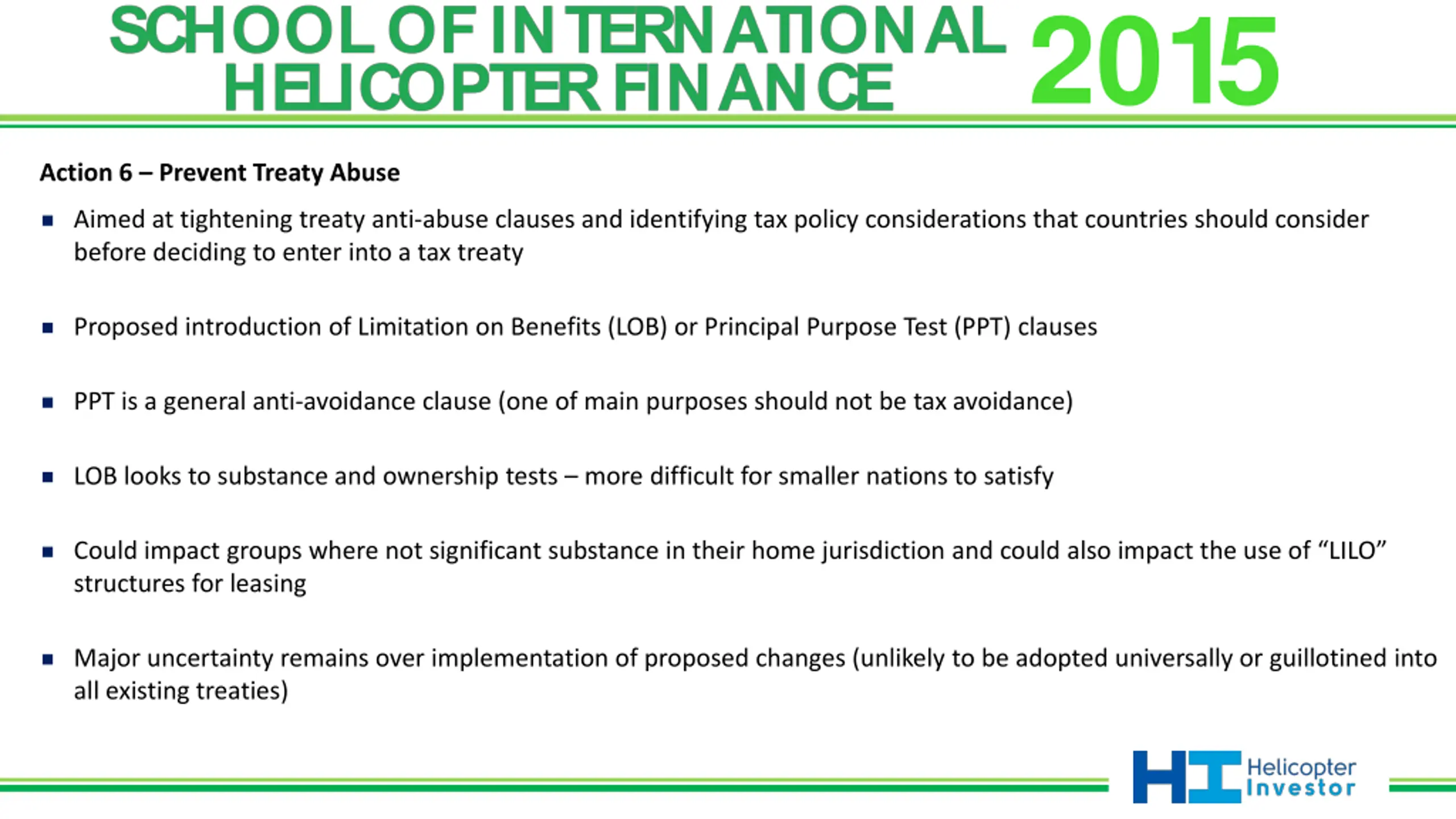 2015 Action 6 Prevent Treaty Abuse Aimed at tightening treaty anti-abuse clauses and identifying tax policy considerations that countries should consider before deciding to enter into a tax treaty Proposed introduction of Limitation on Benefits (LOB) or Principal Purpose Test (PPT) clauses PPT is a general anti-avoidance clause (one of main purposes should not be tax avoidance) LOB looks to substance and ownership tests more difficult for smaller nations to satisfy Could impact groups where not significant substance in their home jurisdiction and could also impact the use of LILO structures for leasing Major uncertainty remains over implementation of proposed changes (unlikely to be adopted universally or guillotined into all existing treaties)