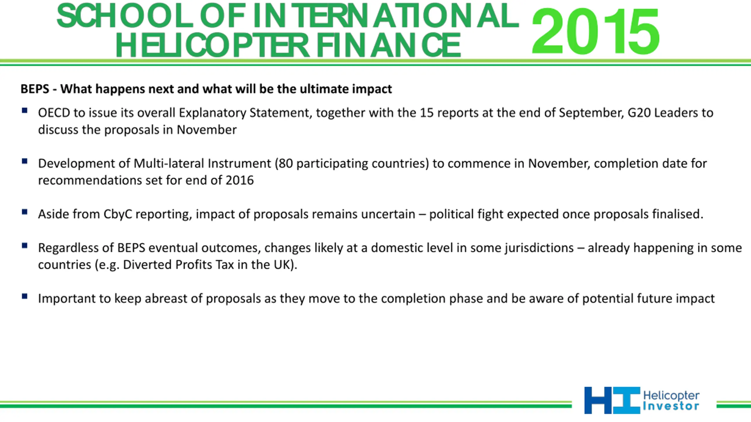 2015 BEPS - What happens next and what will be the ultimate impact OECD to issue its overall Explanatory Statement, together with the 15 reports at the end of September, G20 Leaders to discuss the proposals in November Development of Multi-lateral Instrument (80 participating countries) to commence in November, completion date for recommendations set for end of 2016 Aside from CbyC reporting, impact of proposals remains uncertain political fight expected once proposals finalised. Regardless of BEPS eventual outcomes, changes likely at a domestic level in some jurisdictions already happening in some countries (e.g. Diverted Profits Tax in the UK). Important to keep abreast of proposals as they move to the completion phase and be aware of potential future impact