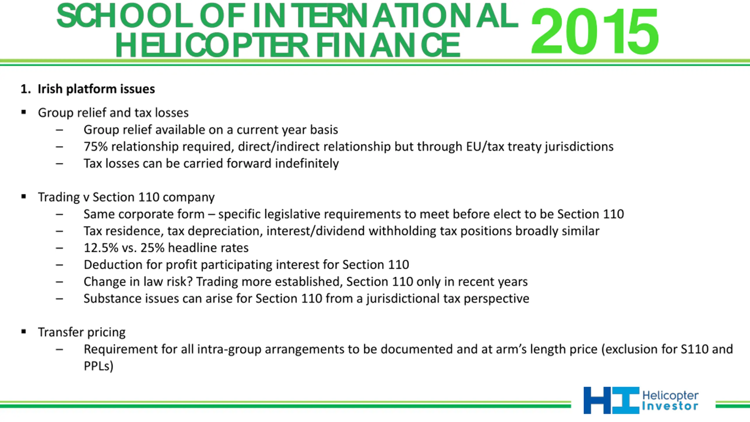 2015 1. Irish platform issues Group relief and tax losses Group relief available on a current year basis 75% relationship required, direct/indirect relationship but through EU/tax treaty jurisdictions Tax losses can be carried forward indefinitely Trading v Section 110 company Same corporate form specific legislative requirements to meet before elect to be Section 110 Tax residence, tax depreciation, interest/dividend withholding tax positions broadly similar 12.5% vs. 25% headline rates Deduction for profit participating interest for Section 110 Change in law risk? Trading more established, Section 110 only in recent years Substance issues can arise for Section 110 from a jurisdictional tax perspective Transfer pricing Requirement for all intra-group arrangements to be documented and at arm s length price (exclusion for S110 and PPLs)