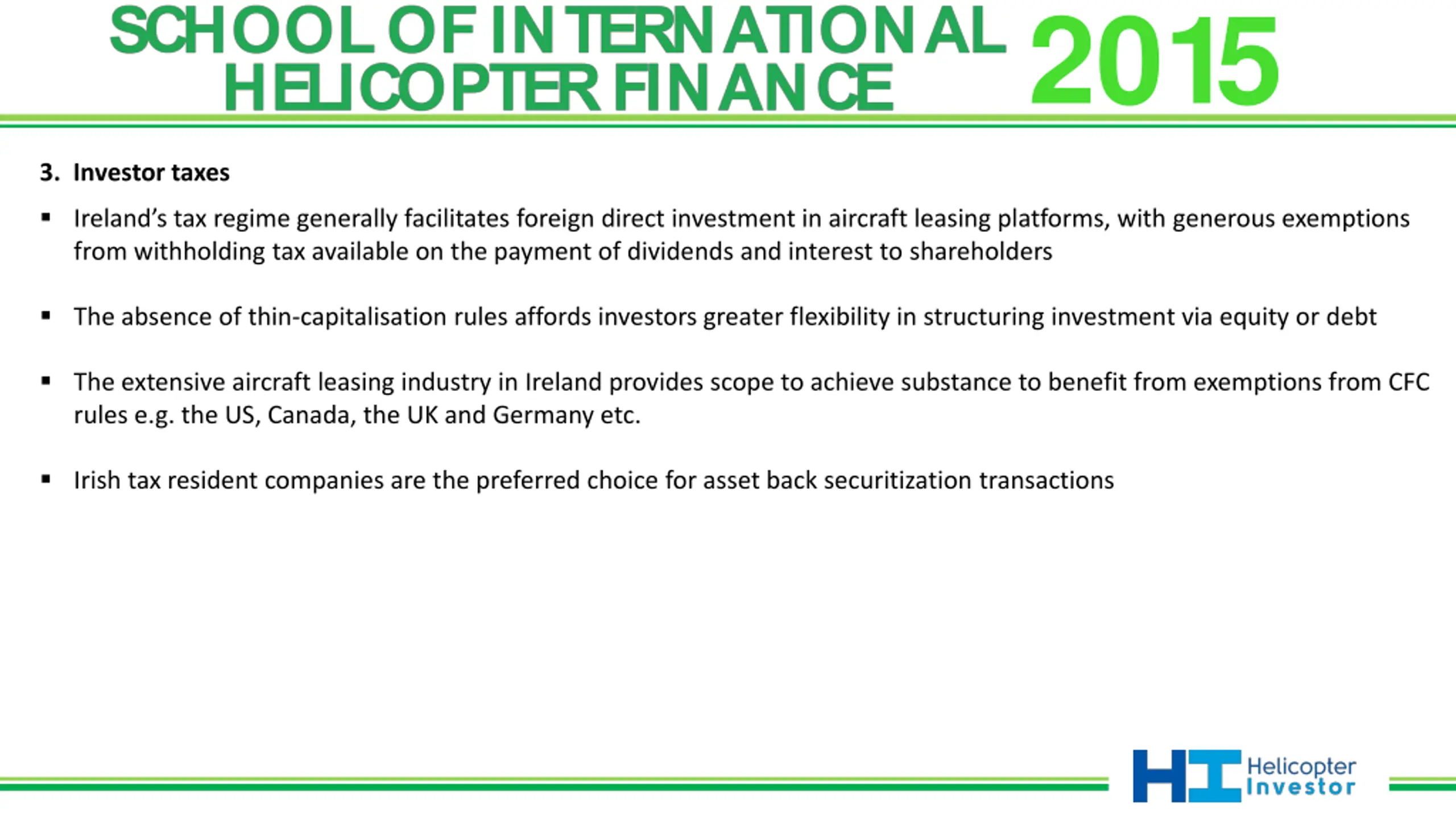 2015 3. Investor taxes Ireland s tax regime generally facilitates foreign direct investment in aircraft leasing platforms, with generous exemptions from withholding tax available on the payment of dividends and interest to shareholders The absence of thin-capitalisation rules affords investors greater flexibility in structuring investment via equity or debt The extensive aircraft leasing industry in Ireland provides scope to achieve substance to benefit from exemptions from CFC rules e.g. the US, Canada, the UK and Germany etc. Irish tax resident companies are the preferred choice for asset back securitization transactions