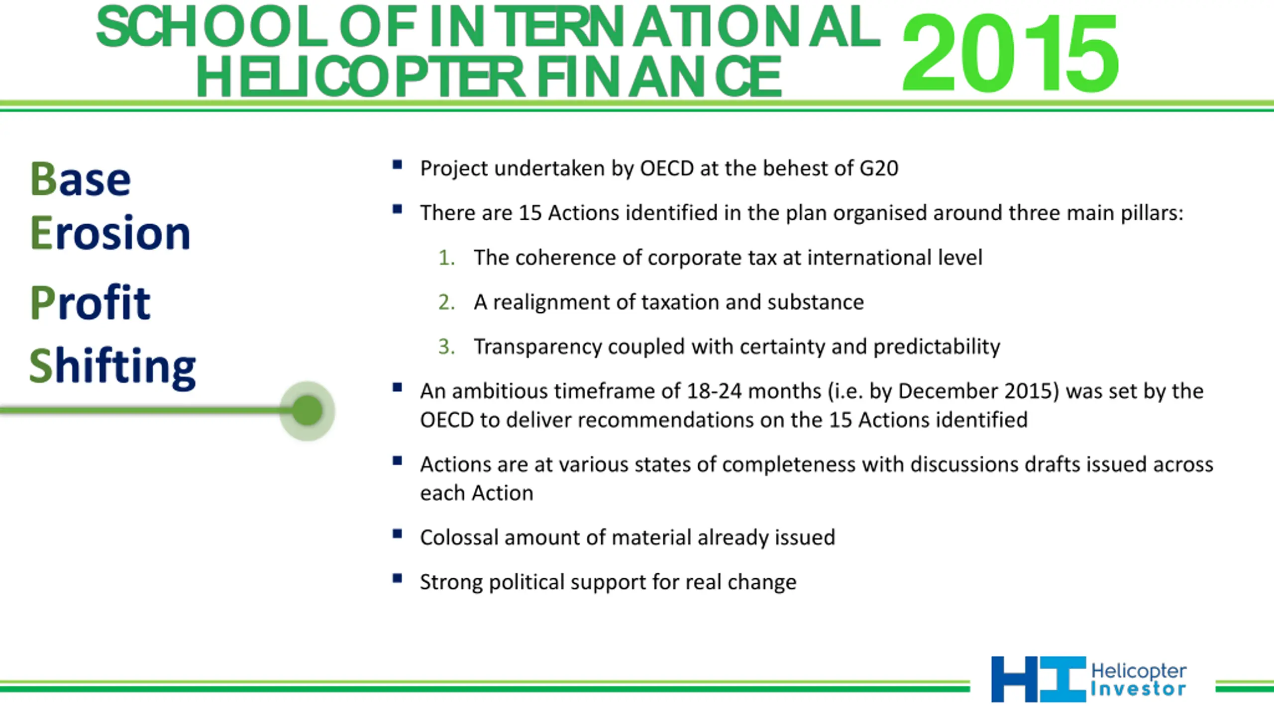 2015 Project undertaken by OECD at the behest of G20 There are 15 Actions identified in the plan organised around three main pillars: Base Erosion Profit Shifting 1. The coherence of corporate tax at international level 2. A realignment of taxation and substance 3. Transparency coupled with certainty and predictability An ambitious timeframe of 18-24 months (i.e. by December 2015) was set by the OECD to deliver recommendations on the 15 Actions identified Actions are at various states of completeness with discussions drafts issued across each Action Colossal amount of material already issued Strong political support for real change