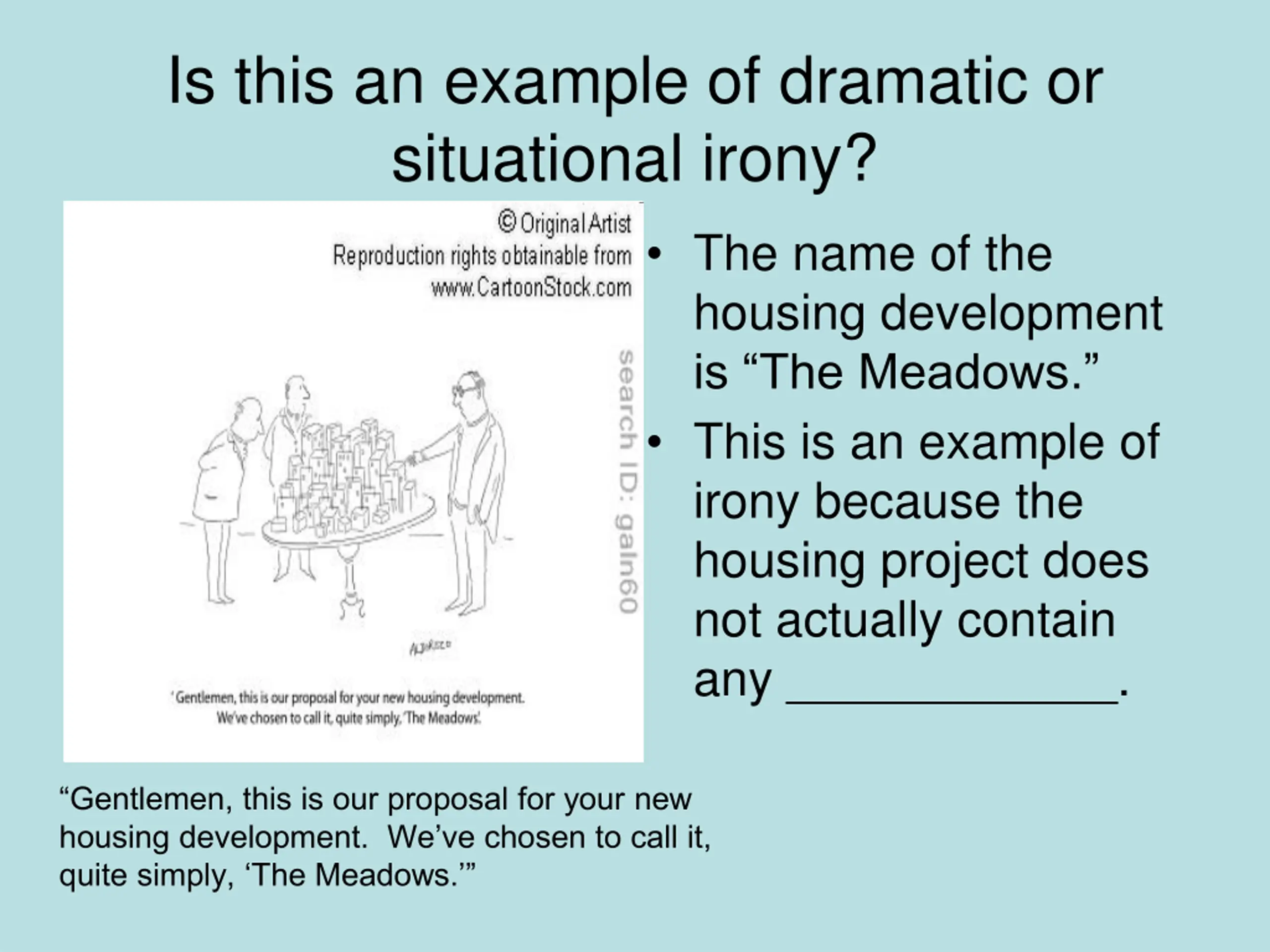 Is this an example of dramatic or situational irony? The name of the housing development is The Meadows. This is an example of irony because the housing project does not actually contain any ____________. Gentlemen, this is our proposal for your new housing development. We ve chosen to call it, quite simply, The Meadows.