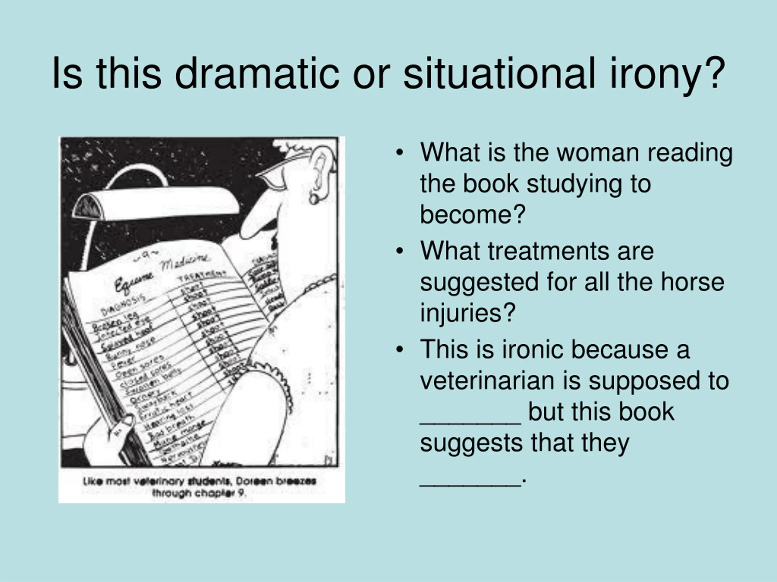 Is this dramatic or situational irony? What is the woman reading the book studying to become? What treatments are suggested for all the horse injuries? This is ironic because a veterinarian is supposed to _______ but this book suggests that they _______.