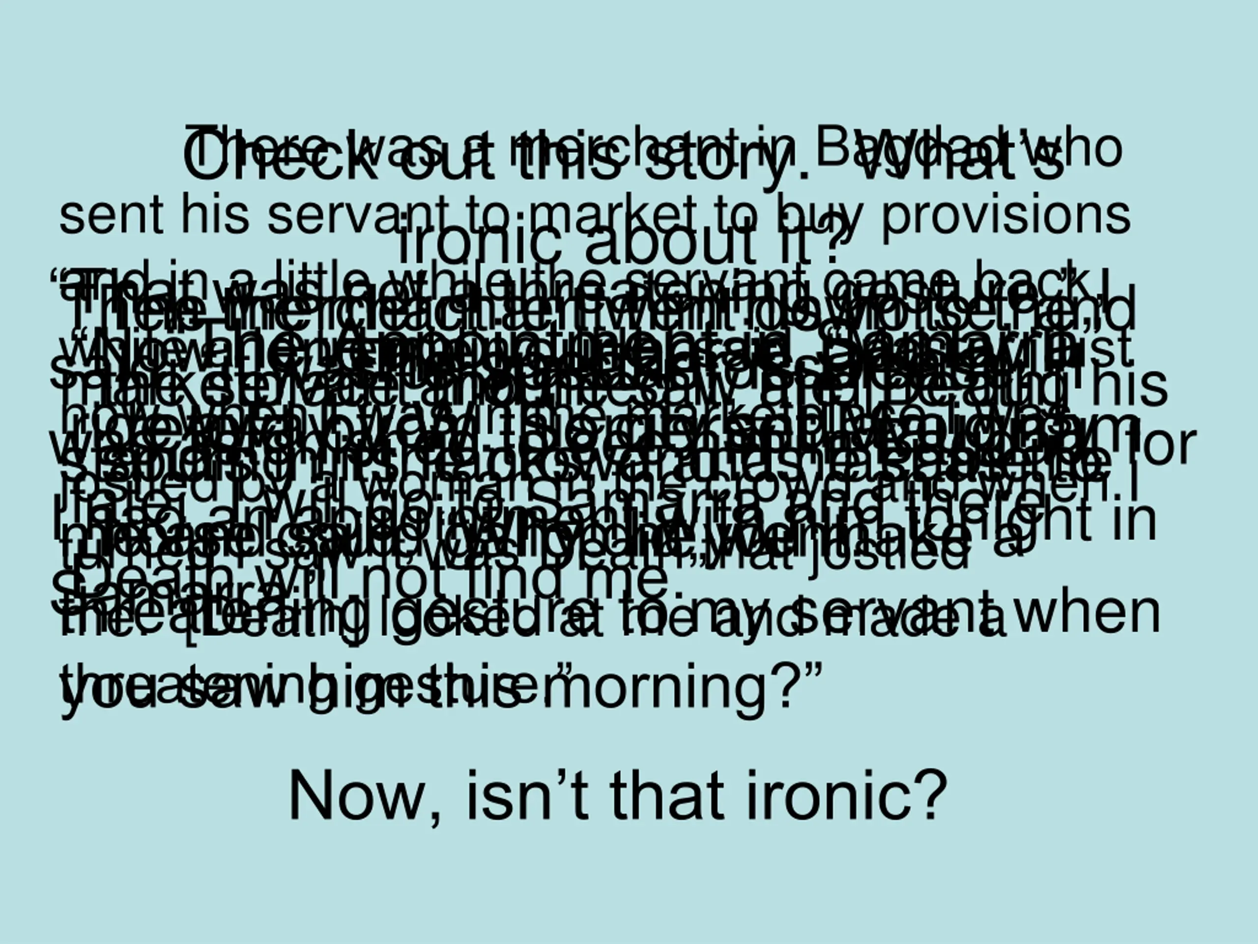 There was a merchant in Bagdad who sent his servant to market to buy provisions and in a little while the servant came back, white and trembling. [He] said, Master, just Now, lend me your horse, and I will the servant mounted it, and he dug his spurs in its flanks, and as fast as the standing in the crowd and he came to Check out this story. What s ironic about it? The Appointment in Samarra retold by W. Somerset Maugham jostled by a woman in the crowd and when I turned I saw it was Death that jostled Death will not find me. threatening gesture to my servant when That was not a threatening gesture, I said, it was only a start of surprise. I was astonished to see him in Bagdad, for I had an appointment with him tonight in Samarra. me. [Death] looked at me and made a threatening gesture. you saw him this morning? The merchant lent him his horse, and Then the merchant went down to the marketplace and he saw me [Death] The speaker is Death now when I was in the marketplace I was ride away from this city and avoid my fate. I will go to Samarra and there horse could gallop he went. me and said, Why did you make a Now, isn t that ironic?