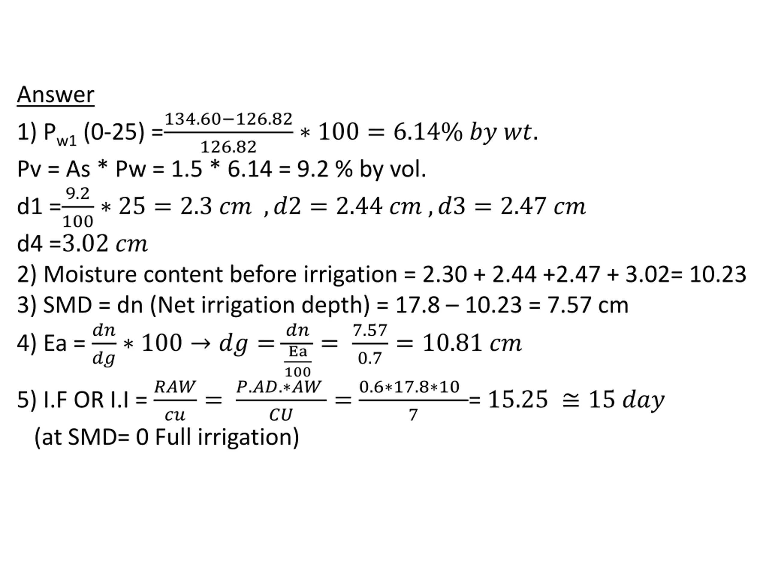 Answer 1) Pw1(0-25) =134.60 126.82 Pv = As * Pw = 1.5 * 6.14 = 9.2 % by vol. d1 =9.2 100 25 = 2.3 ?? ,?2 = 2.44 ?? ,?3 = 2.47 ?? d4 =3.02 ?? 2) Moisture content before irrigation = 2.30 + 2.44 +2.47 + 3.02= 10.23 3) SMD = dn (Net irrigation depth) = 17.8 10.23 = 7.57 cm 4) Ea = ?? ?? 100 ?? = 100 5) I.F OR I.I = ??? ??= ?? (at SMD= 0 Full irrigation) 100 = 6.14% ?? ??. 126.82 ?? Ea 7.57 0.7= 10.81 ?? =0.6 17.8 10 7 = ?.??. ?? = 15.25 15 ???
