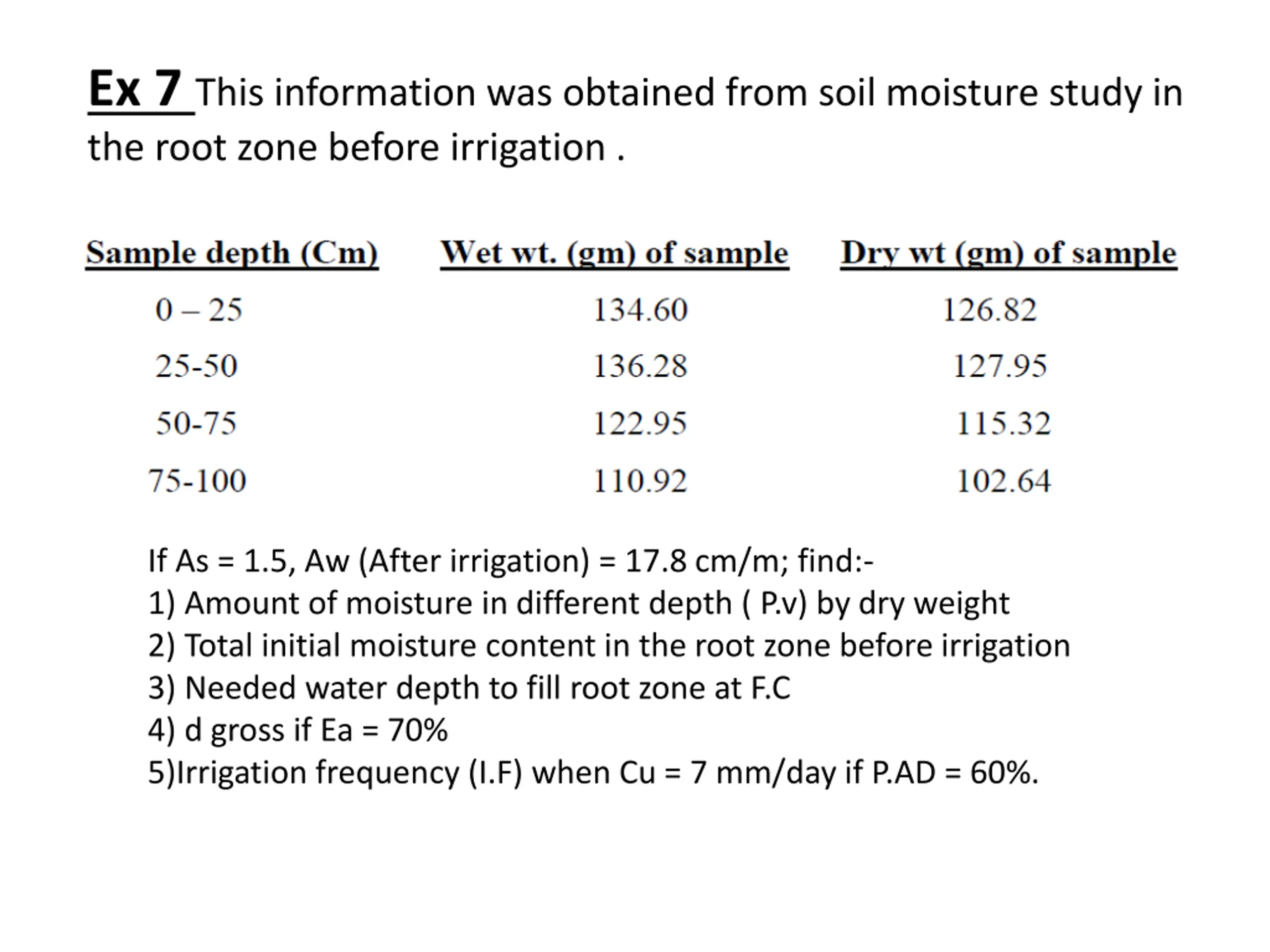 Ex 7 This information was obtained from soil moisture study in the root zone before irrigation . If As = 1.5, Aw (After irrigation) = 17.8 cm/m; find:- 1) Amount of moisture in different depth ( P.v) by dry weight 2) Total initial moisture content in the root zone before irrigation 3) Needed water depth to fill root zone at F.C 4) d gross if Ea = 70% 5)Irrigation frequency (I.F) when Cu = 7 mm/day if P.AD = 60%.