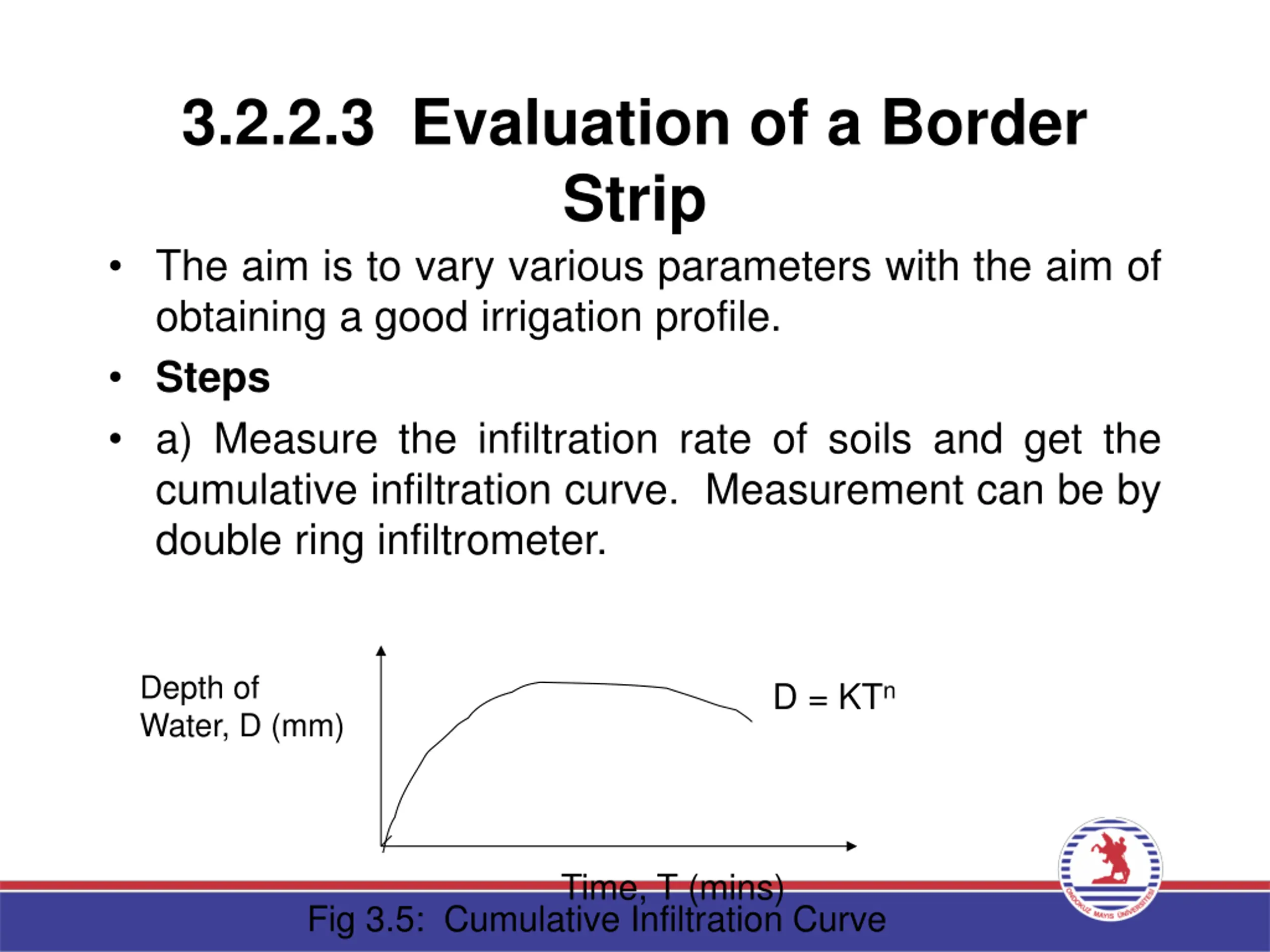 3.2.2.3 Evaluation of a Border Strip The aim is to vary various parameters with the aim of obtaining a good irrigation profile. Steps a) Measure the infiltration rate of soils and get the cumulative infiltration curve. Measurement can be by double ring infiltrometer. Depth of Water, D (mm) D = KTn Time, T (mins) Fig 3.5: Cumulative Infiltration Curve