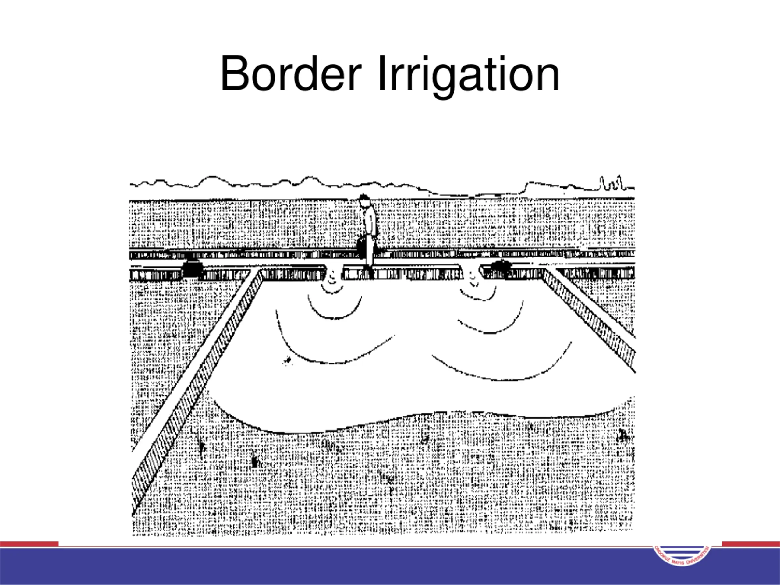 Border Irrigation Contd. In border irrigation, water is applied slowly. The root zone is applied water gradually down the field. At a time, the application flow is cut-off to reduce water loses. Ideally, there is no runoff and deep percolation. The problem is that the time to cut off the inflow is difficult to determine.