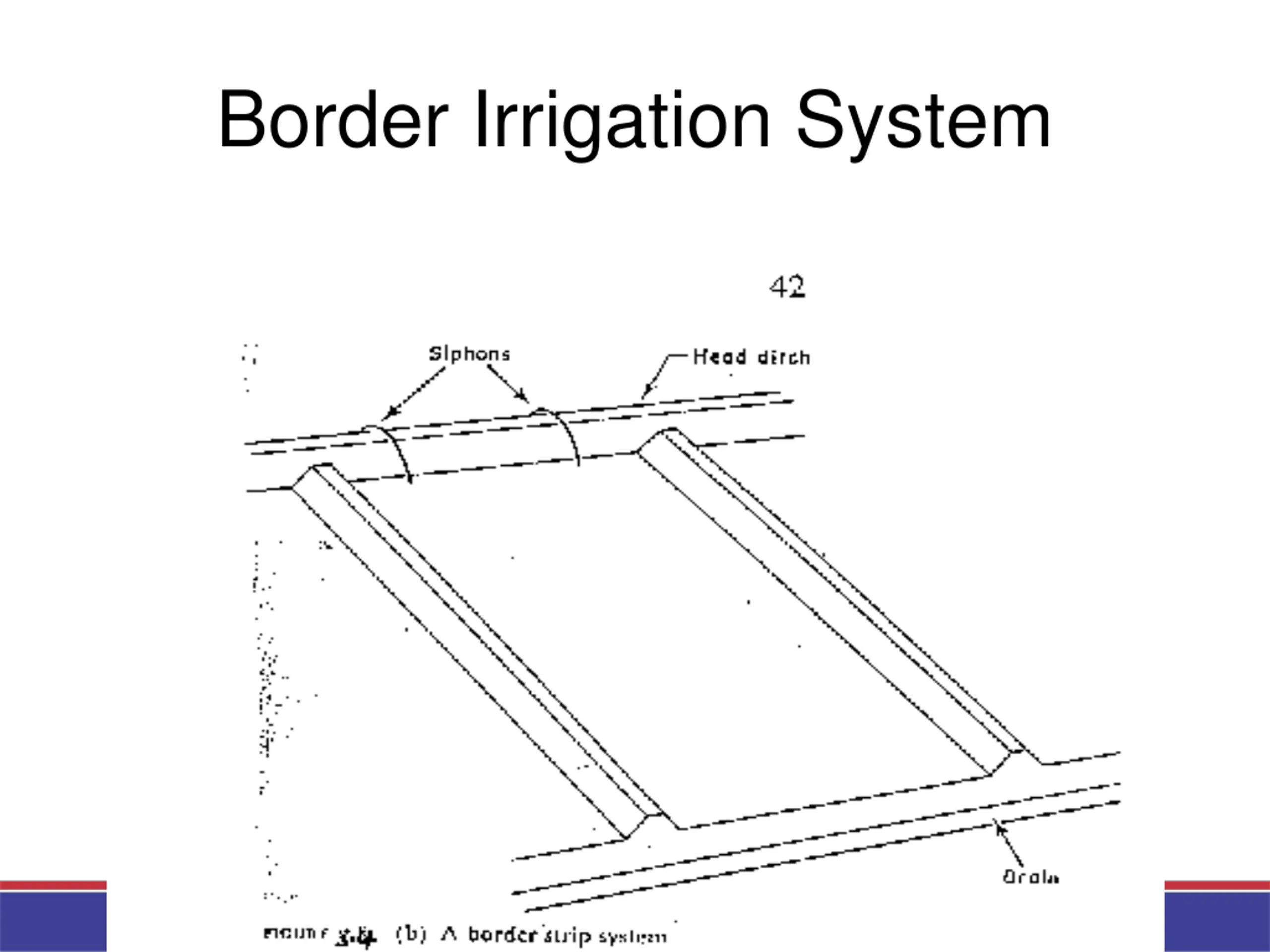 3.2.2. Border Irrigation System In a border irrigation, controlled surface flooding is practised whereby the field is divided up into strips by parallel ridges or dykes and each strip is irrigated separately by introducing progressively covers the entire strip. Border irrigation is suited for crops that can withstand flooding for a short time e.g. wheat. It can be used for all crops provided that the system is designated to provide the needed water control for irrigation of crops. It is suited to soils between extremely high and very low infiltration rates. water upstream and it