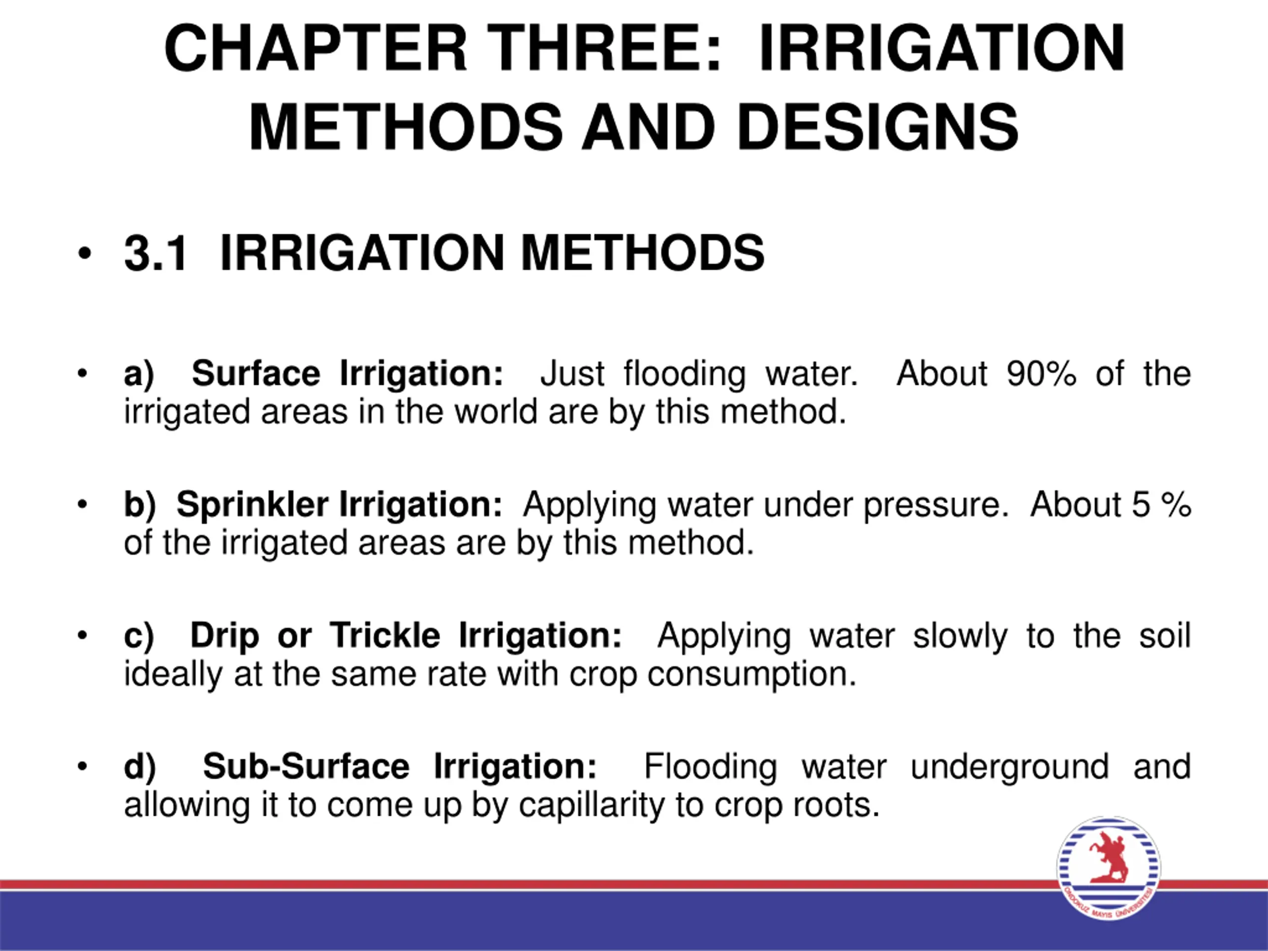 CHAPTER THREE: IRRIGATION METHODS AND DESIGNS 3.1 IRRIGATION METHODS Just flooding water. About 90% of the a) irrigated areas in the world are by this method. Surface Irrigation: b) Sprinkler Irrigation: Applying water under pressure. About 5 % of the irrigated areas are by this method. Applying water slowly to the soil c) ideally at the same rate with crop consumption. Drip or Trickle Irrigation: Flooding water underground and d) allowing it to come up by capillarity to crop roots. Sub-Surface Irrigation: