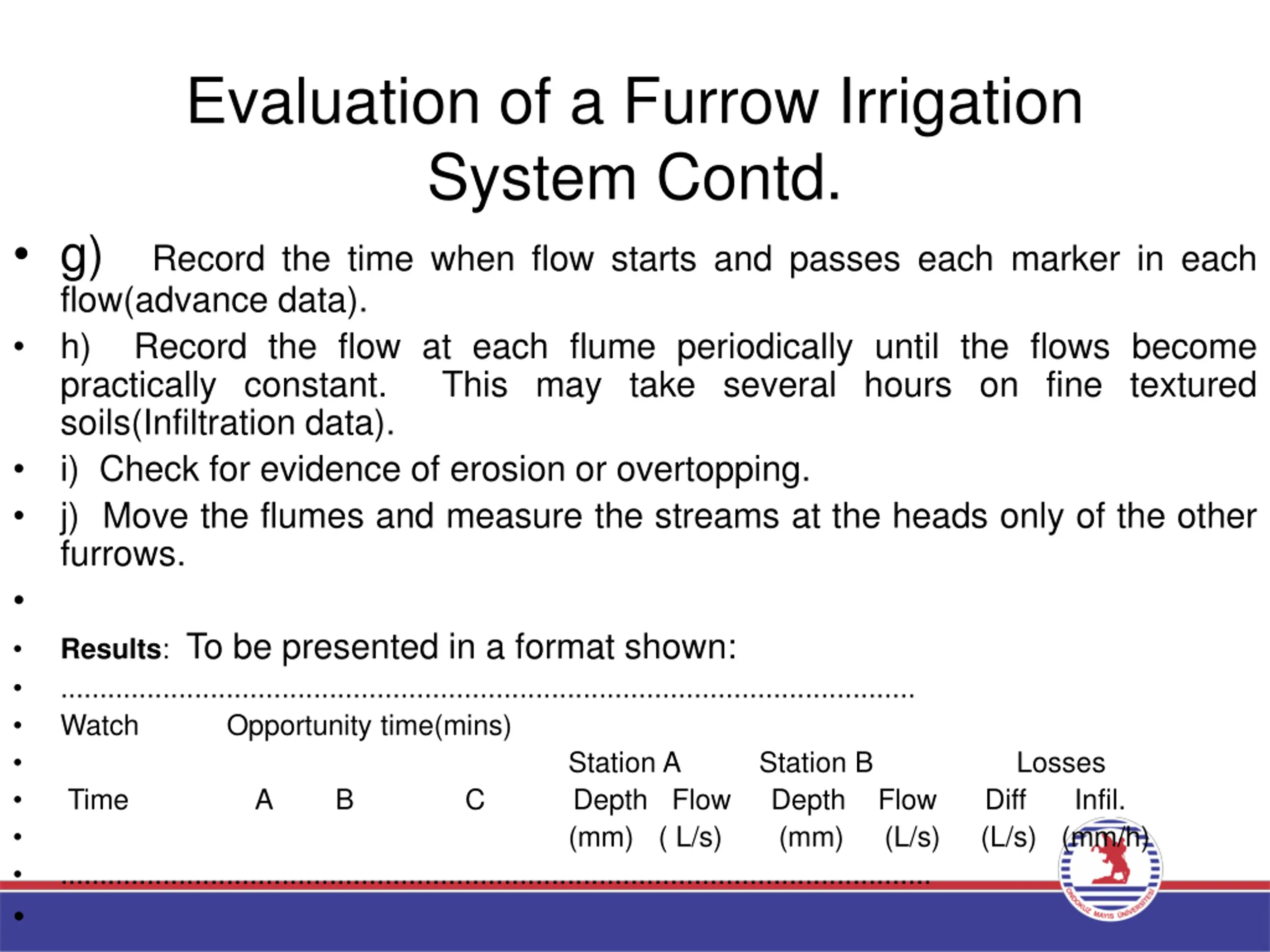 Evaluation of a Furrow Irrigation System Contd. Procedure a) Select several (say 3 or more) uniform test furrows which should be typical of those in the area. b) Measure the average furrow spacing and note the shape, condition etc. c) Set the marker stakes at 30 m intervals down the furrows. d) Take levels at each stake and determine the average slope. e) Set the flumes say 30 m apart at the head of the middle furrow. f) Pass constant flow streams down the furrows, using wide range of flows. The largest flow should just cause erosion and overtopping, the smallest might just reach the end of the furrow. The median stream should have a discharge of about Q = 3/4 S (l/s) where S is the % slope.