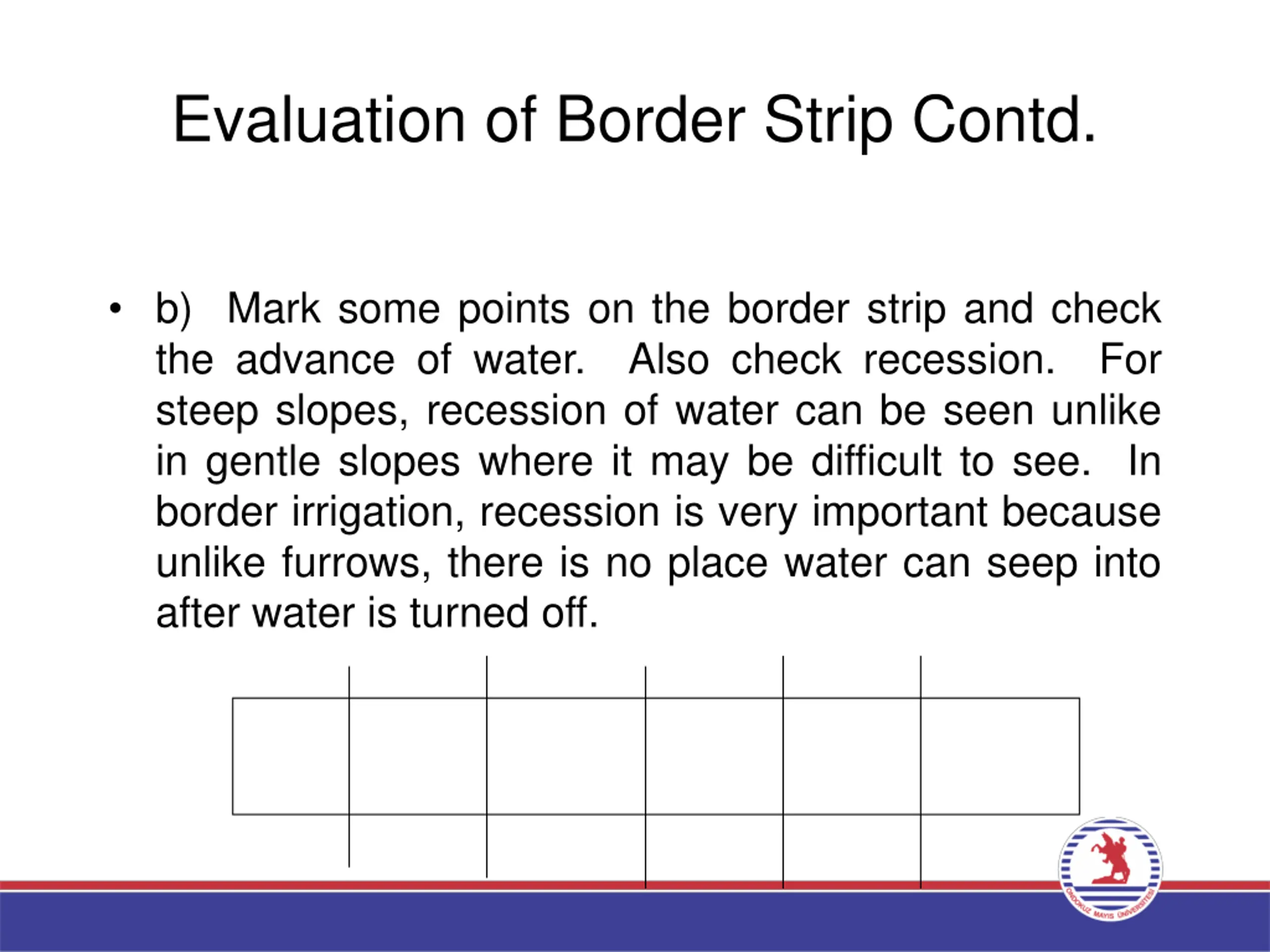 Evaluation of Border Strip Contd. b) Mark some points on the border strip and check the advance of water. Also check recession. steep slopes, recession of water can be seen unlike in gentle slopes where it may be difficult to see. In border irrigation, recession is very important because unlike furrows, there is no place water can seep into after water is turned off. For