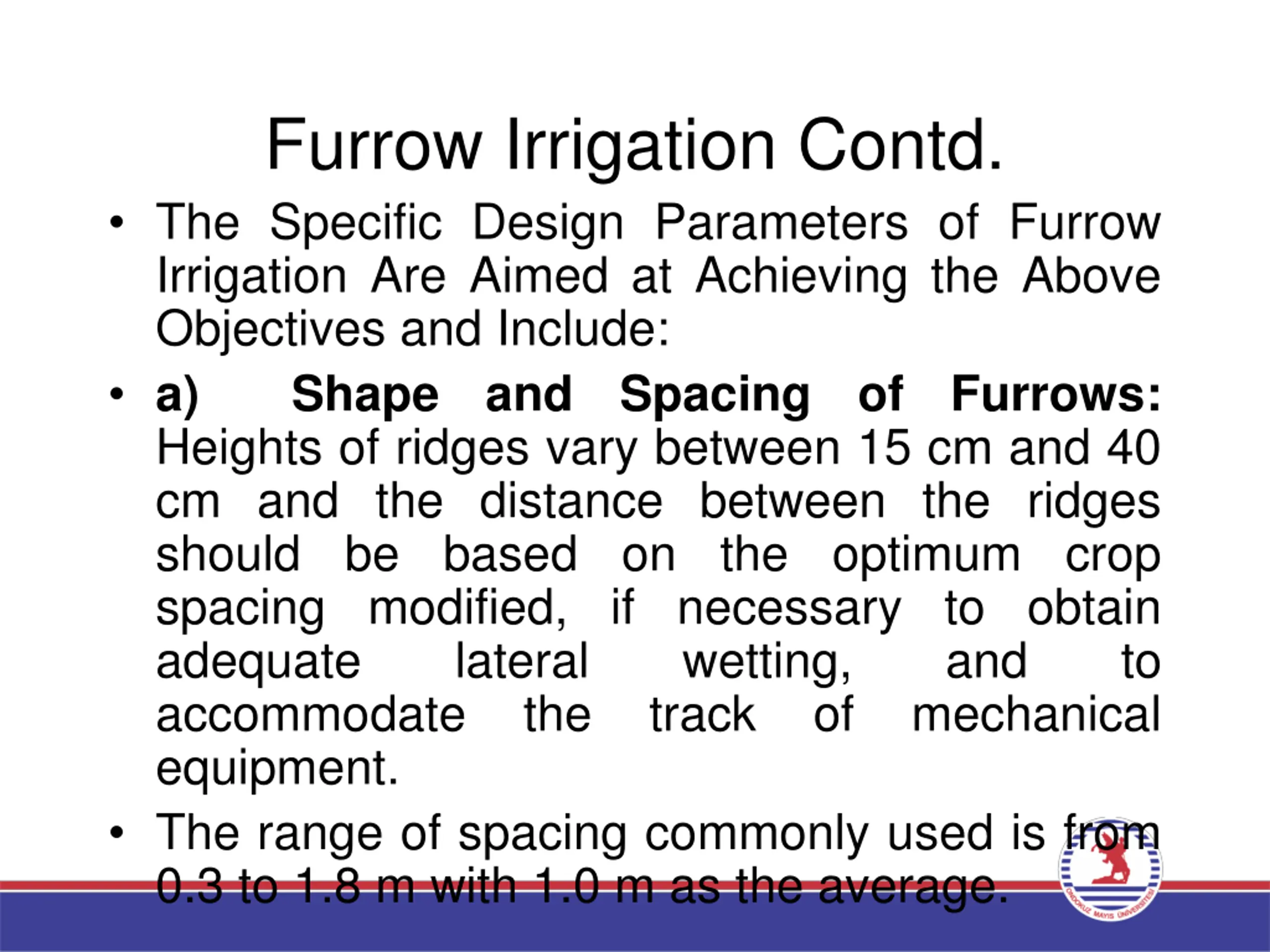 Furrow Irrigation Contd. The Specific Design Parameters of Furrow Irrigation Are Aimed at Achieving the Above Objectives and Include: a) Shape and Spacing Heights of ridges vary between 15 cm and 40 cm and the distance between the ridges should be based on the optimum crop spacing modified, if necessary to obtain adequate lateral accommodate the equipment. The range of spacing commonly used is from 0.3 to 1.8 m with 1.0 m as the average. of Furrows: wetting, track and mechanical to of