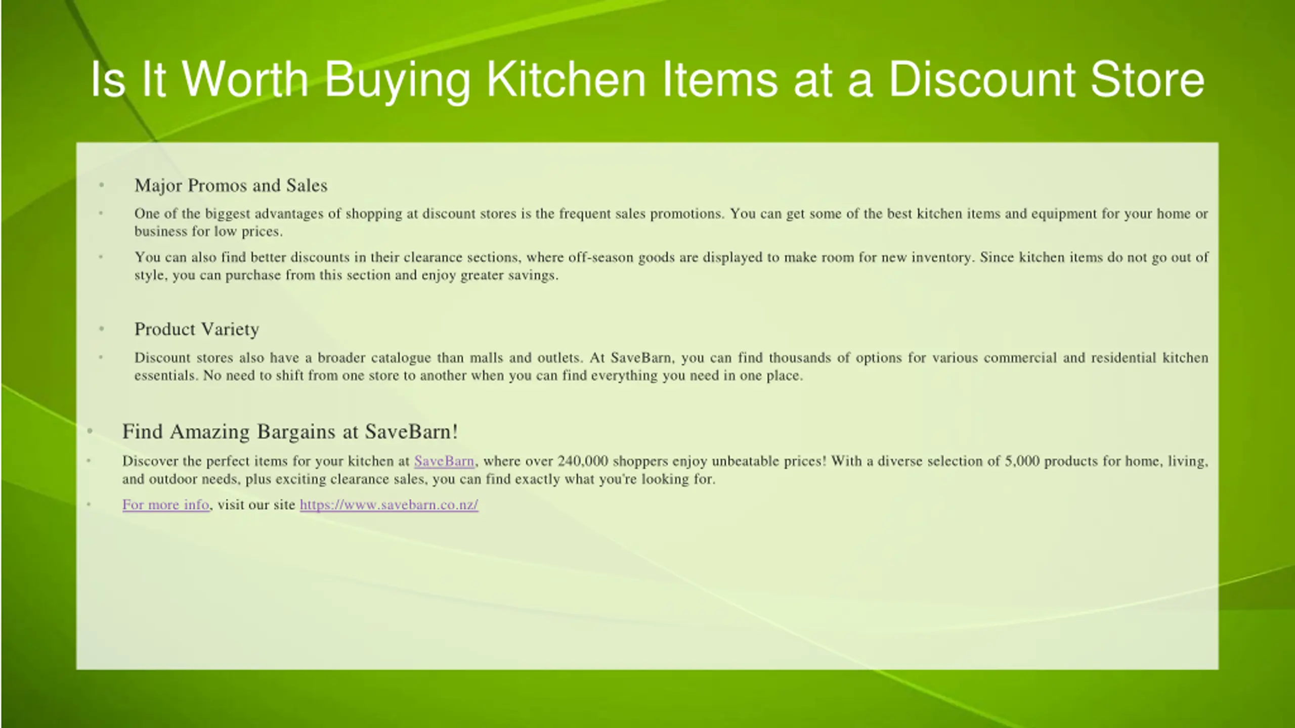 Is It Worth Buying Kitchen Items at a Discount Store Major Promos and Sales One of the biggest advantages of shopping at discount stores is the frequent sales promotions. You can get some of the best kitchen items and equipment for your home or business for low prices. You can also find better discounts in their clearance sections, where off-season goods are displayed to make room for new inventory. Since kitchen items do not go out of style, you can purchase from this section and enjoy greater savings. Product Variety Discount stores also have a broader catalogue than malls and outlets. At SaveBarn, you can find thousands of options for various commercial and residential kitchen essentials. No need to shift from one store to another when you can find everything you need in one place. Find Amazing Bargains at SaveBarn! Discover the perfect items for your kitchen at SaveBarn, where over 240,000 shoppers enjoy unbeatable prices! With a diverse selection of 5,000 products for home, living, and outdoor needs, plus exciting clearance sales, you can find exactly what you're looking for. For more info, visit our site https://www.savebarn.co.nz/