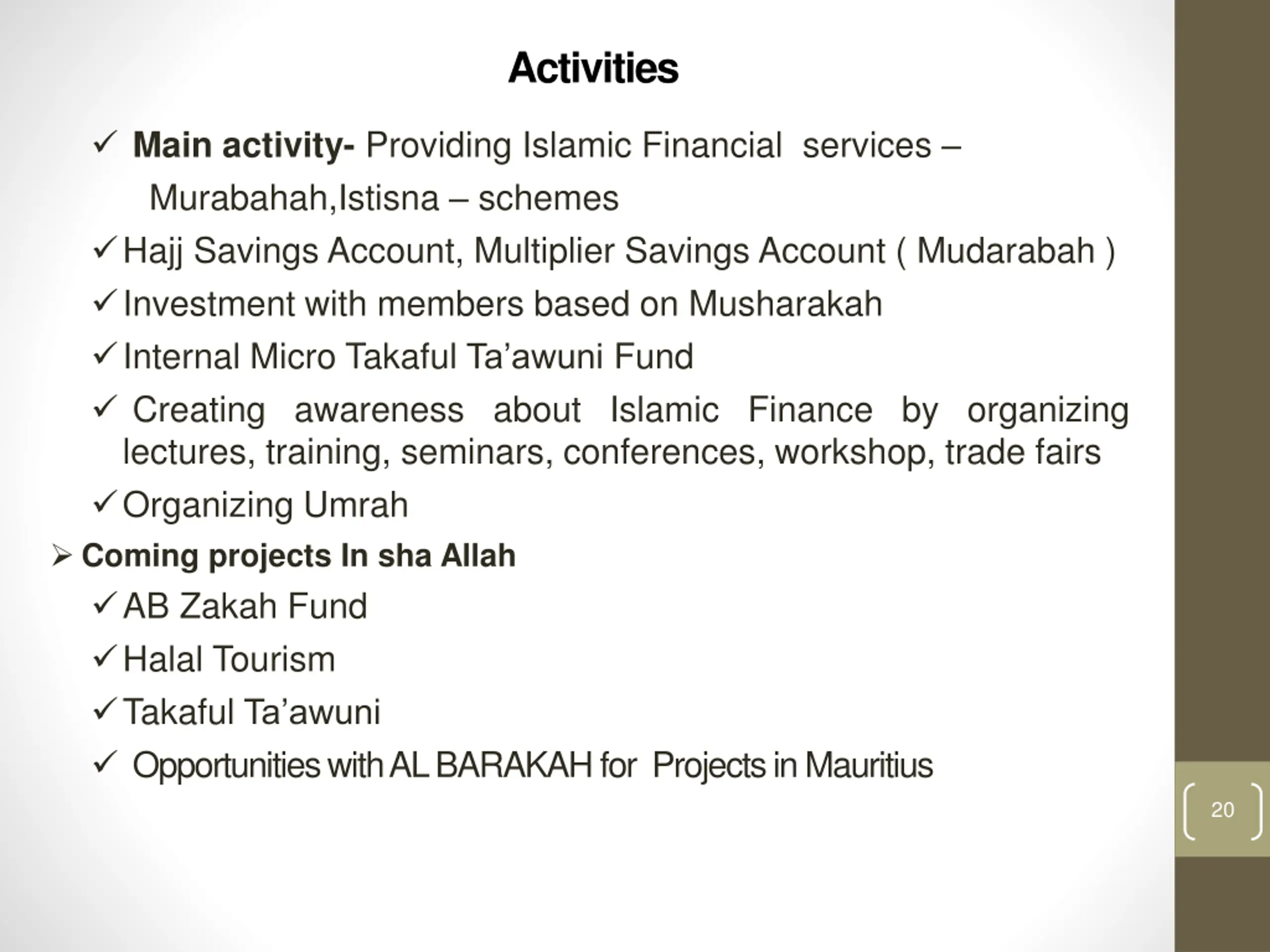 Activities Main activity- Providing Islamic Financial services Murabahah,Istisna schemes Hajj Savings Account, Multiplier Savings Account ( Mudarabah ) Investment with members based on Musharakah Internal Micro Takaful Ta awuni Fund Creating awareness about Islamic Finance by organizing lectures, training, seminars, conferences, workshop, trade fairs Organizing Umrah Coming projects In sha Allah AB Zakah Fund Halal Tourism Takaful Ta awuni Opportunities with AL BARAKAH for Projects in Mauritius 20