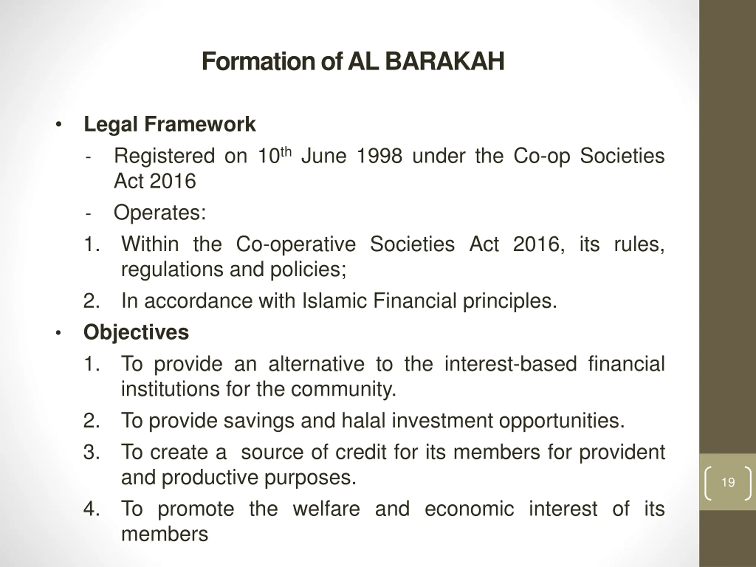 Formation of AL BARAKAH Legal Framework - Registered on 10th June 1998 under the Co-op Societies Act 2016 - Operates: 1. Within the Co-operative Societies Act 2016, its rules, regulations and policies; 2. In accordance with Islamic Financial principles. Objectives 1. To provide an alternative to the interest-based financial institutions for the community. 2. To provide savings and halal investment opportunities. 3. To create a source of credit for its members for provident and productive purposes. 4. To promote the welfare and economic interest of its members 19